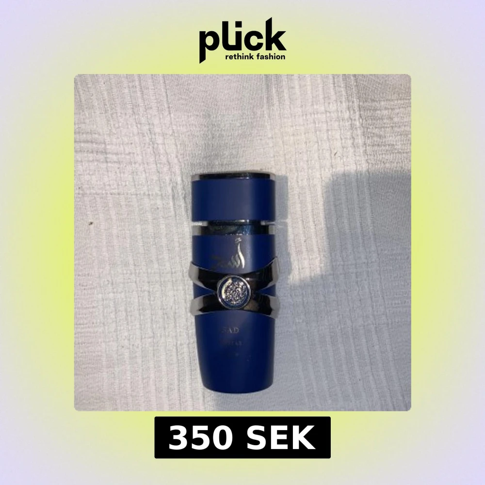 Snygg parfymflaska i matt mörkblått med silverdetaljer och arabisk text. Flaskan har en unik form med en dekorativ silverring och ett blått emblem i mitten. Sprayfunktion och matchande blått lock. Perfekt för dig som gillar exklusiv design och orientaliska dofter.