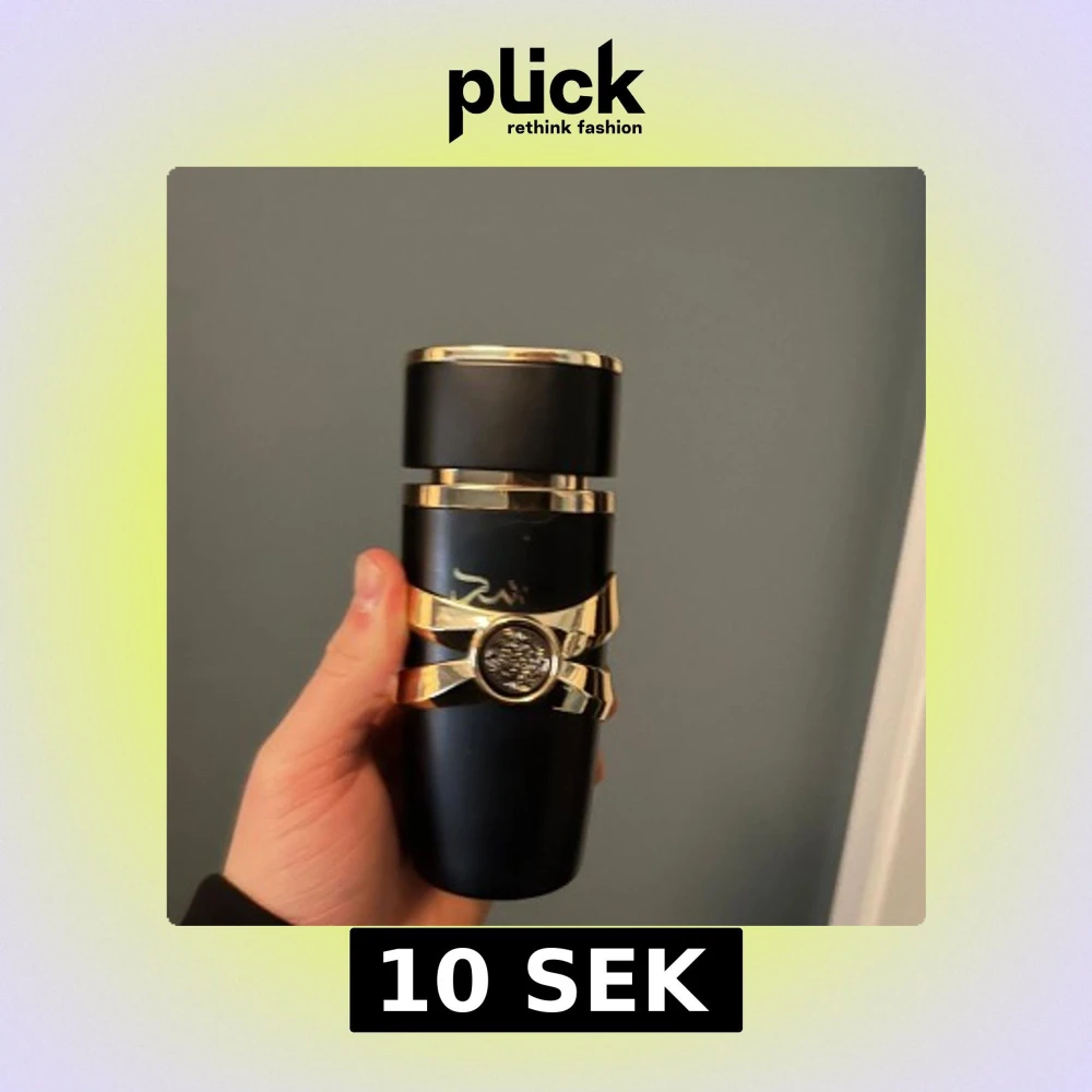 Elegant parfymflaska i svart med gyllene detaljer från Lattafa. Flaskan har en unik design med ett dekorativt band och arabiska bokstäver. Perfekt för den som söker en lyxig doftupplevelse.