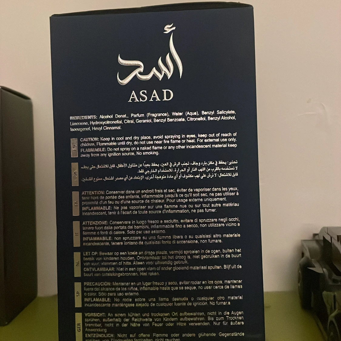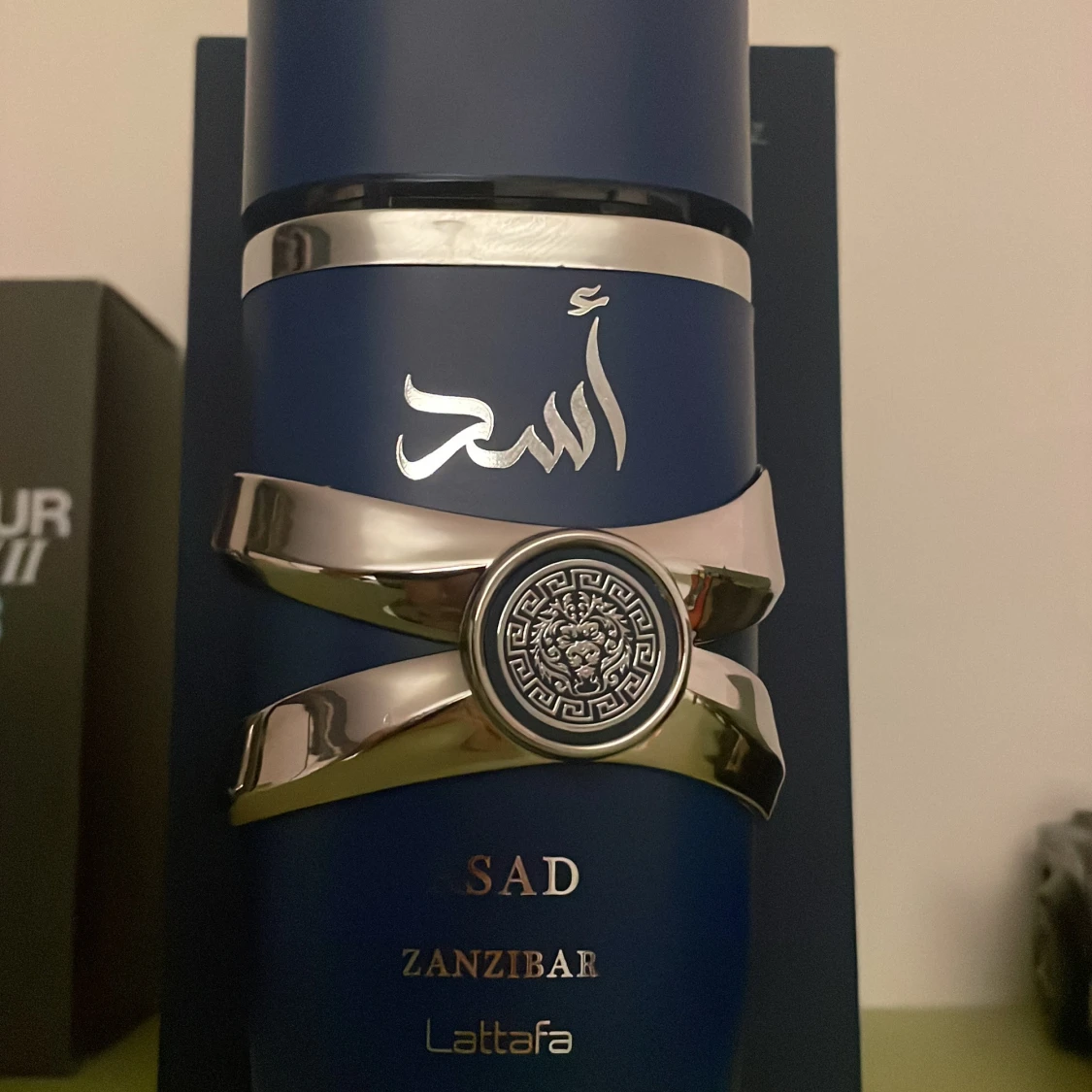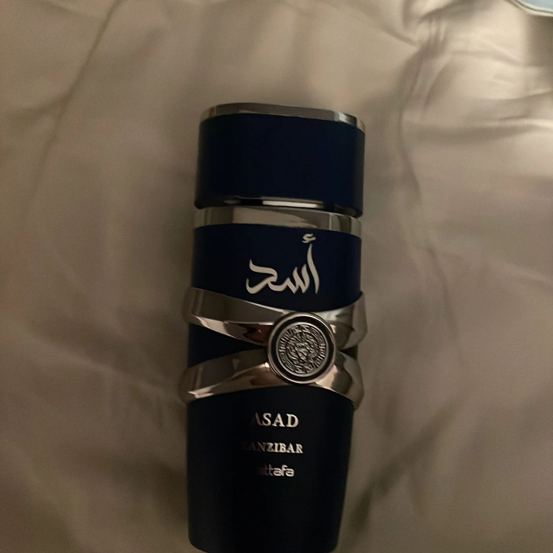 95-97 ml. Jätte lite använt. Säljer en elegant Asad Zanzibar Eau de Parfum från Lattafa. Flaskan är djupblå med silverdetaljer och har en unik design med ett dekorativt emblem. Perfekt för den som söker en sofistikerad doftupplevelse. Den håller lukten i 6-8 timmar och kan hålla längre om man lägger vaseline. Man får många komplimanger med det.