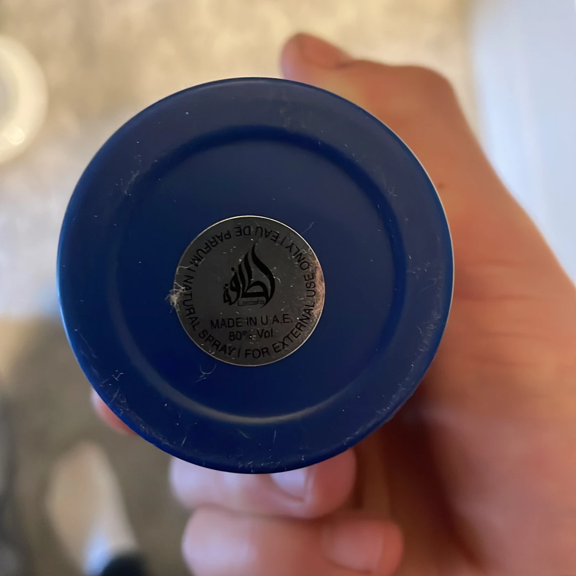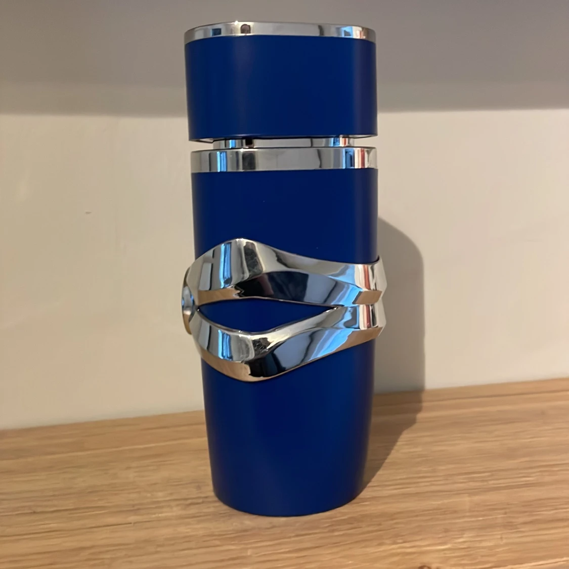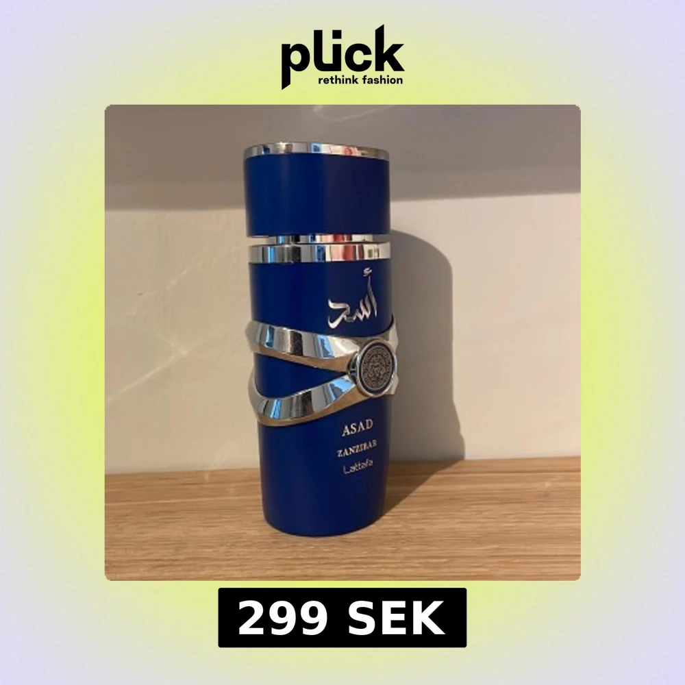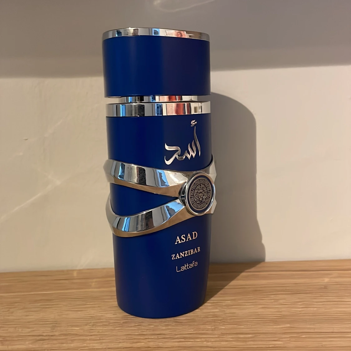 Snygg parfymflaska i djupblå färg med silvriga detaljer och arabiska inskriptioner. Märkt med 'Asad Zanzibar' och Lattafa. Flaskan har en unik design med metallband runt mitten och är tillverkad i U.A.E. Flaskan är också i princip full, säljer för att jag helt enkelt har för många parfymer