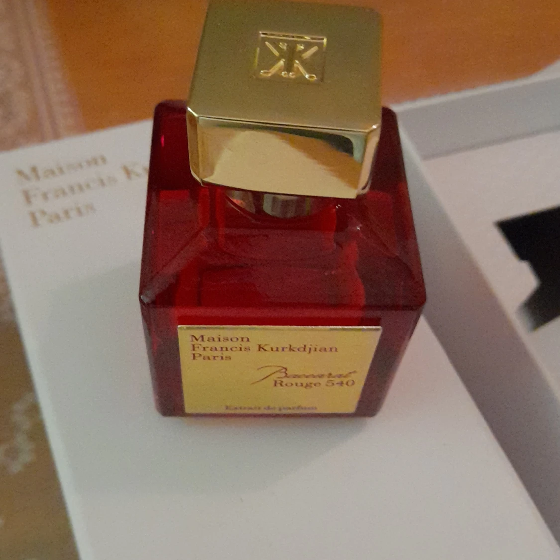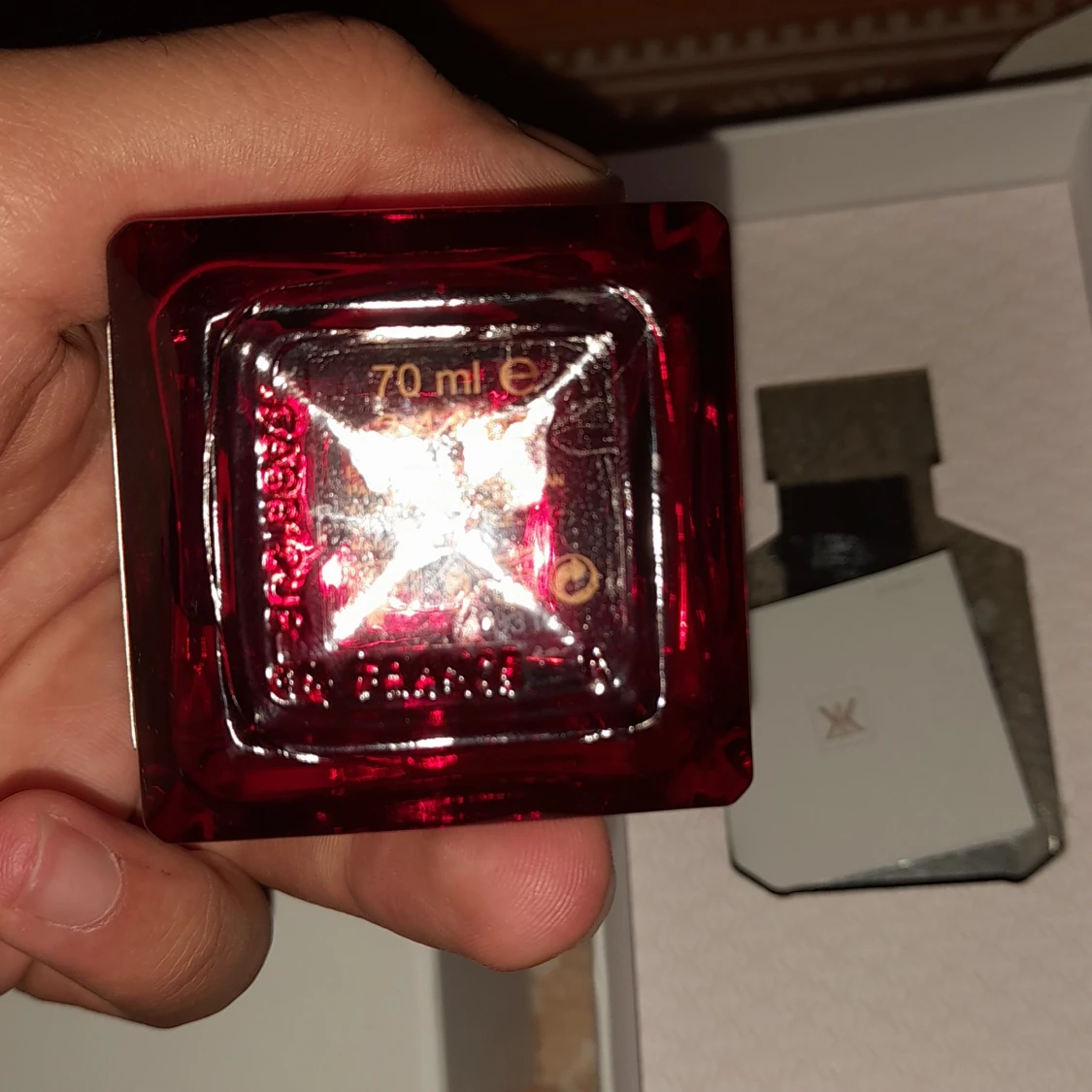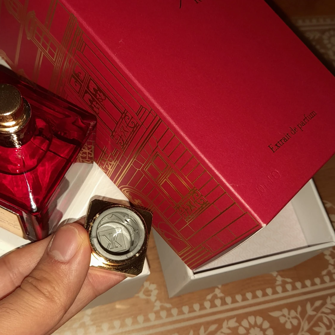Lyxig parfym i en elegant röd flaska med guldfärgad kork. Det är 68 ml kvar. Doften är en exklusiv extrait de parfum, perfekt för den som söker något unikt och sofistikerat.