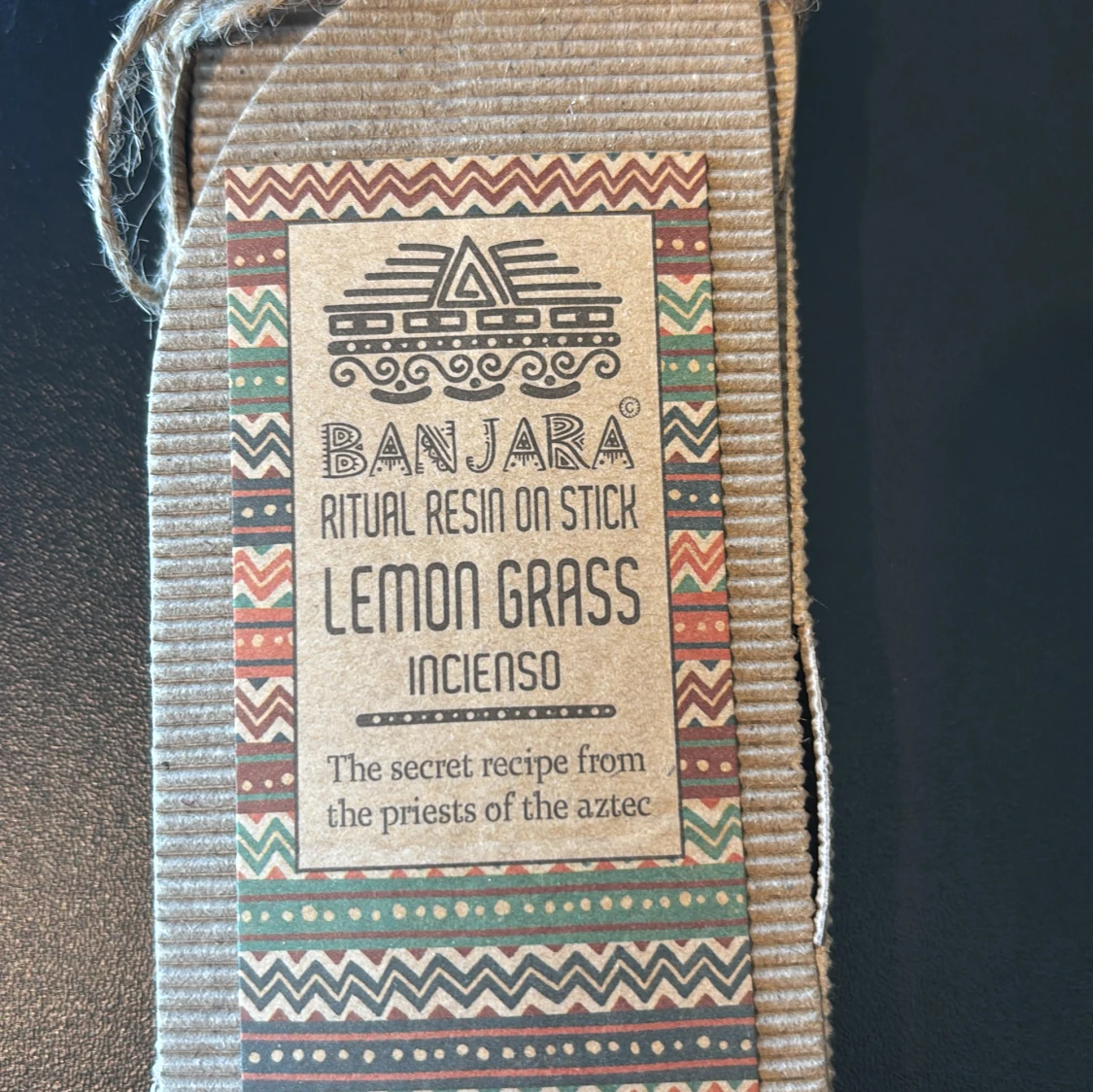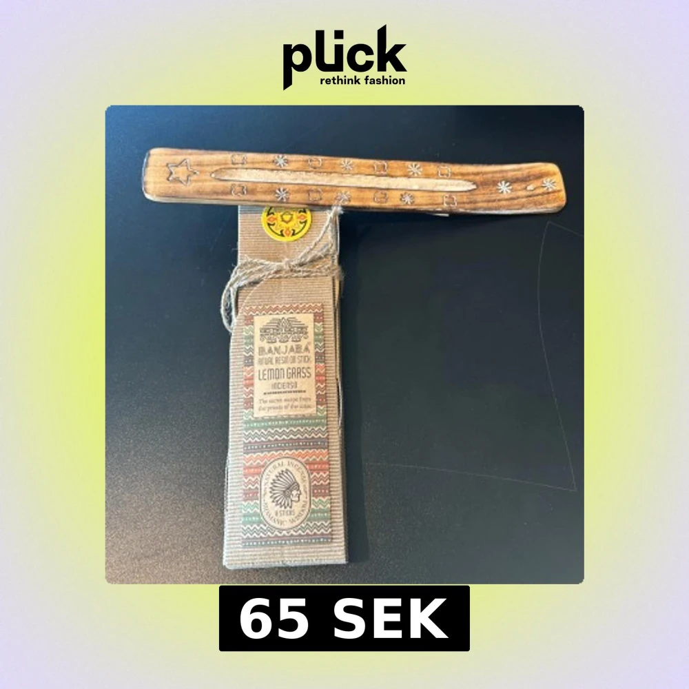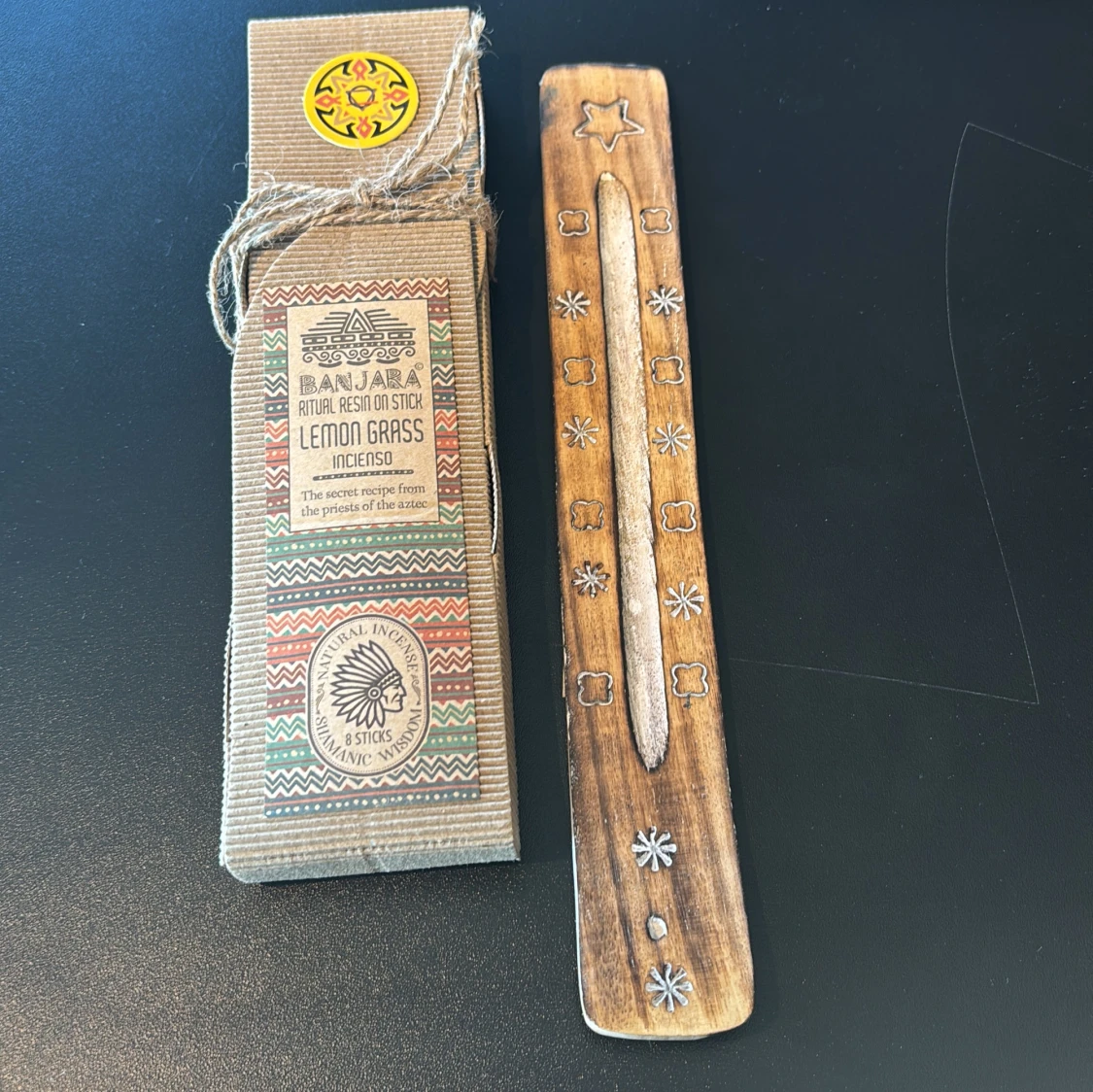 Banjara Lemongrass rökelse med en dekorativ träbricka. Rökelsen kommer i en förpackning med etniskt mönster och textilband. Träbrickan är brun med ingraverade stjärnor och blommor, perfekt för att hålla rökelsestickor på plats.