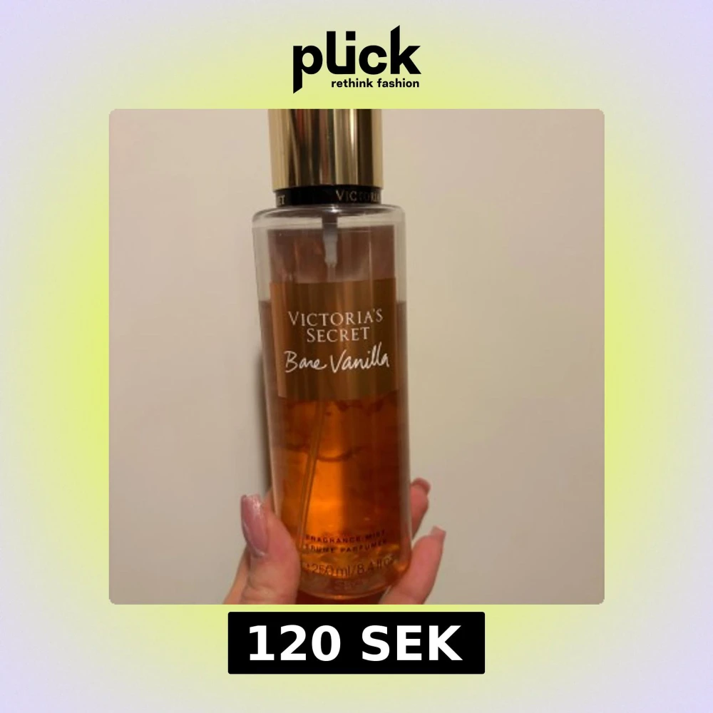 Säljer en Bare Vanilla Fragrance Mist från Victoria's Secret. Flaskan är genomskinlig med en gyllene vätska och har en elegant guldlock. Perfekt för dig som älskar en söt och varm vaniljdoft. Flaskan rymmer 250 ml från början, mängden kvar syns på bilden 🥰