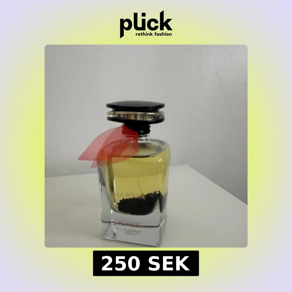 Elegant parfymflaska med en svart och silverfärgad kork. Flaskan är dekorerad med ett rött band runt halsen och innehåller en ljusgul vätska. Perfekt för den som söker en sofistikerad doftupplevelse.