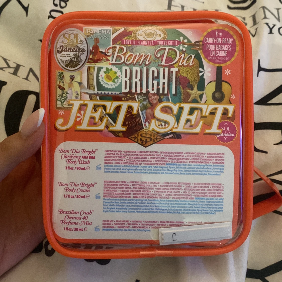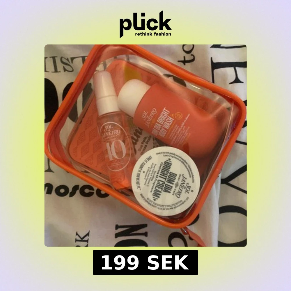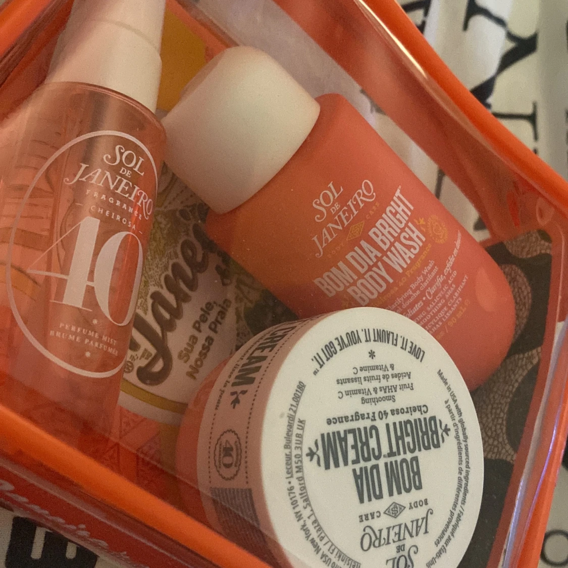 Set med Bom Dia Bright Body Wash, Bom Dia Bright Cream och Brazilian Crush Cheirosa 40 Perfume Mist från Sol de Janeiro. Alla produkter kommer i en snygg orange necessär, perfekt för resan. Doften är fräsch och tropisk. Helt oanvänd!❤️säljer för att ja ej använder. Original pris ca 350