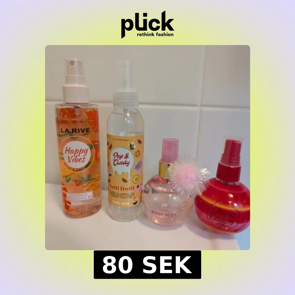 Set med 4 st body mists. La rive-Happy vibes 200 ml (se mängd kvar), Pop & Candy - Tutti Frutt 150 ml endast testad, H&M- Cherry Body mist 100 ml endast testad och H&M- Chupa Chyps 100 ml endast testad. 60 kr för alla 4.