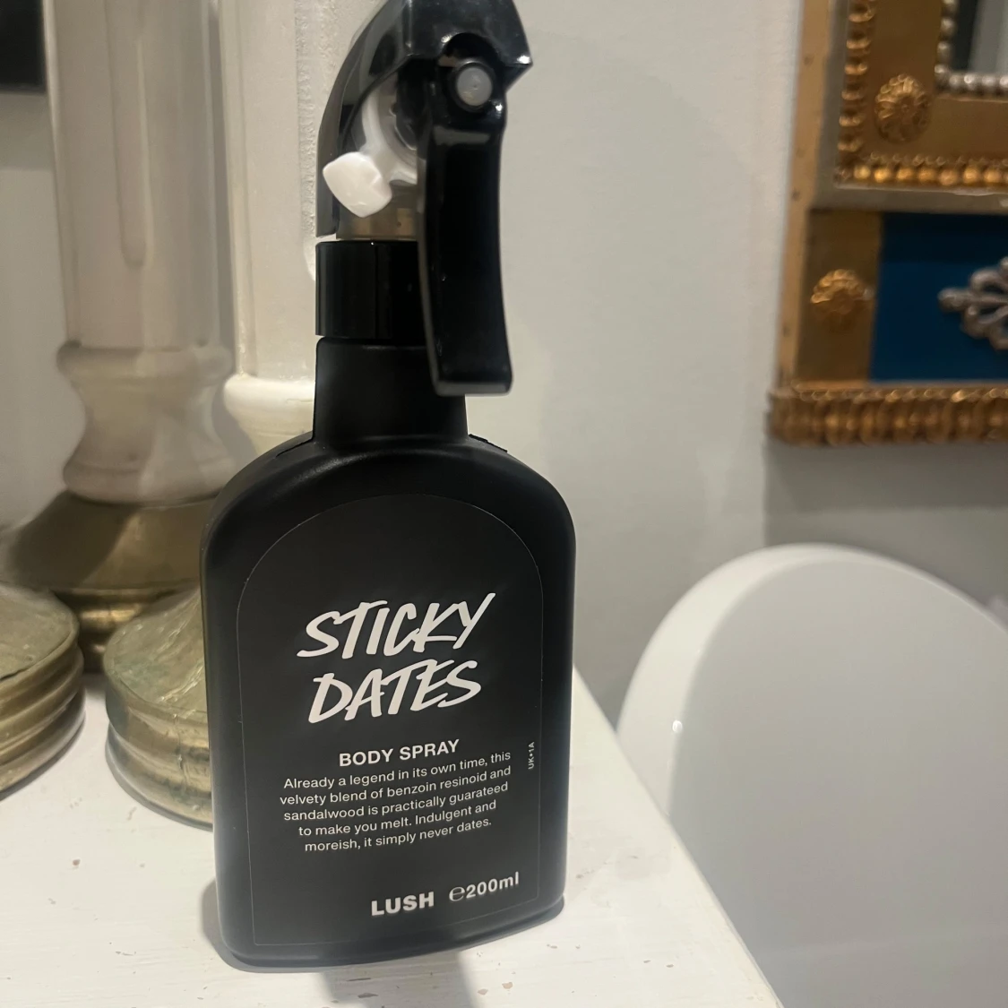 Säljer en 200 ml flaska av Sticky Dates limited edition Body Spray från Lush. Den har en söt och varm doft av dadlar och sandelträ, perfekt för att känna sig fräsch och unik. Perfekt för daglig användning. Har endast testat sprayen den är som helt ny. Ord pris 365 kr