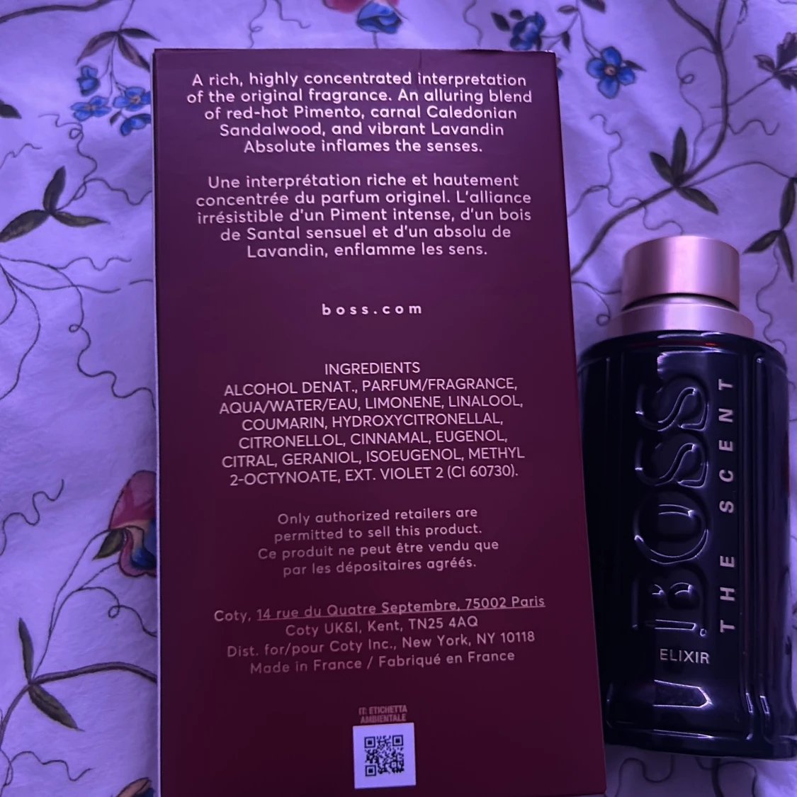 Boss The Scent Elixir Parfum Intense, 100ml. (runt 90ml kvar) Ingredienser: Alcohol Denat., Parfum/Fragrance, Aqua/Water/Eau, Limonene, Linalool, Coumarin, Hydroxycitronellal, Citronellol, Cinnamal, Eugenol, Citral, Geraniol, Isoeugenol, Methyl 2-Octynoate, Ext. Violet 2 (CI 60730). Tillverkad i Frankrike.