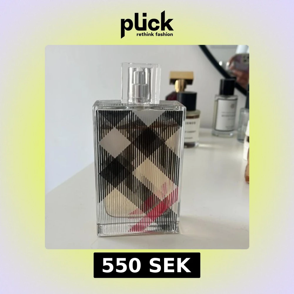 Burberry Brit Eau de Parfum i en rektangulär glasflaska med det klassiska rutmönstret i svart, vitt och rött. Flaskan har en transparent spraykork och stilren design som känns både modern och tidlös. Perfekt för dig som gillar eleganta och ikoniska dofter. Nästan 100ml