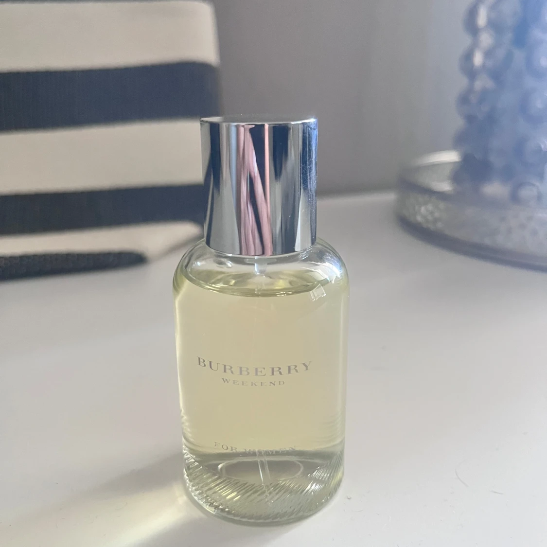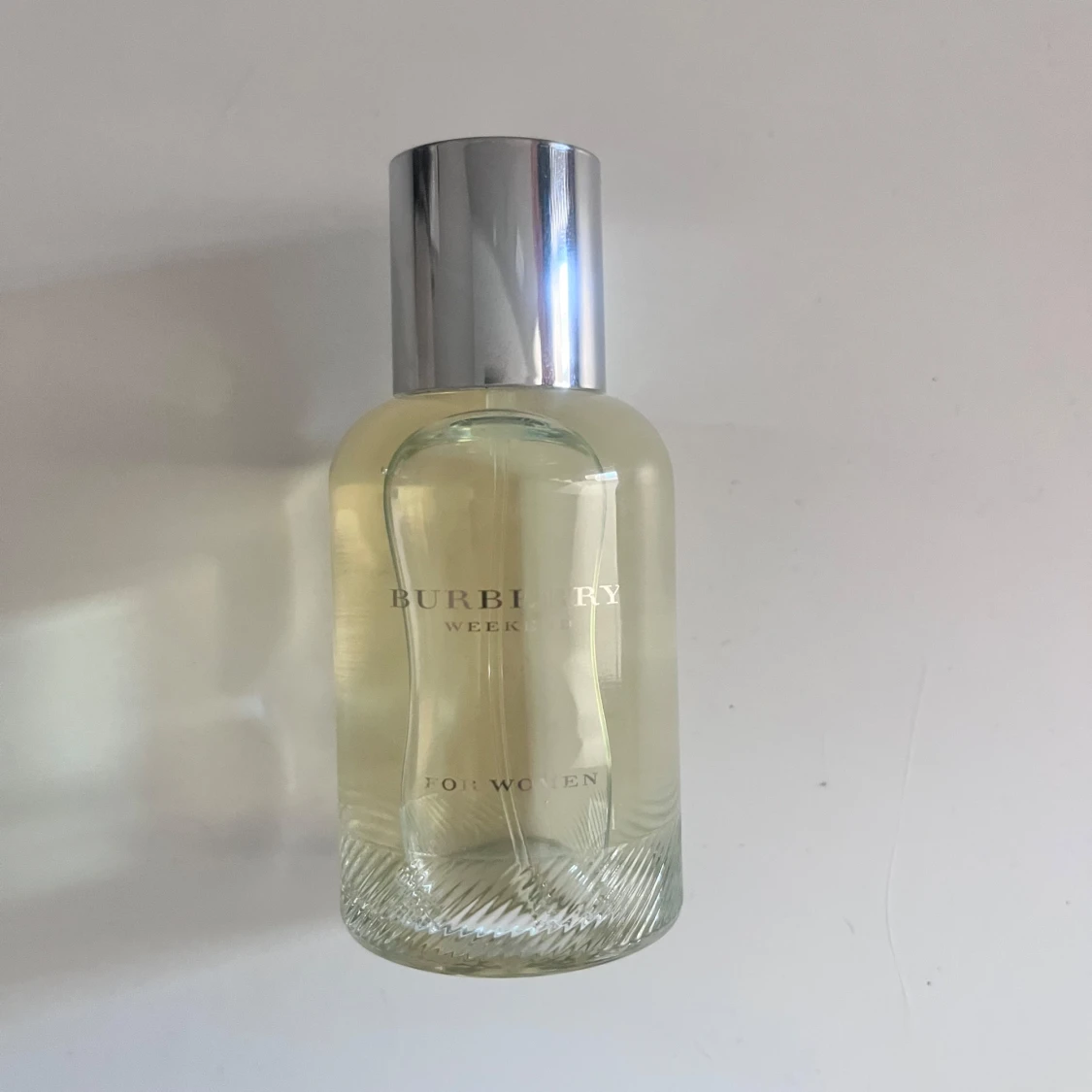Burberry Weekend Eau de Parfum för kvinnor, 50 ml. Flaskan är rundad i genomskinligt glas med silverfärgad metallkork. Parfymen har en ljusgul ton och kommer i en stilren beige kartong med diskret mönster och svart text. Aldrig använt