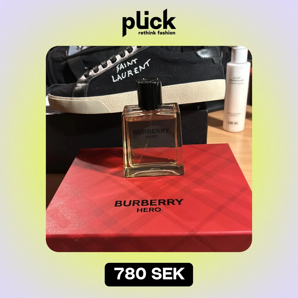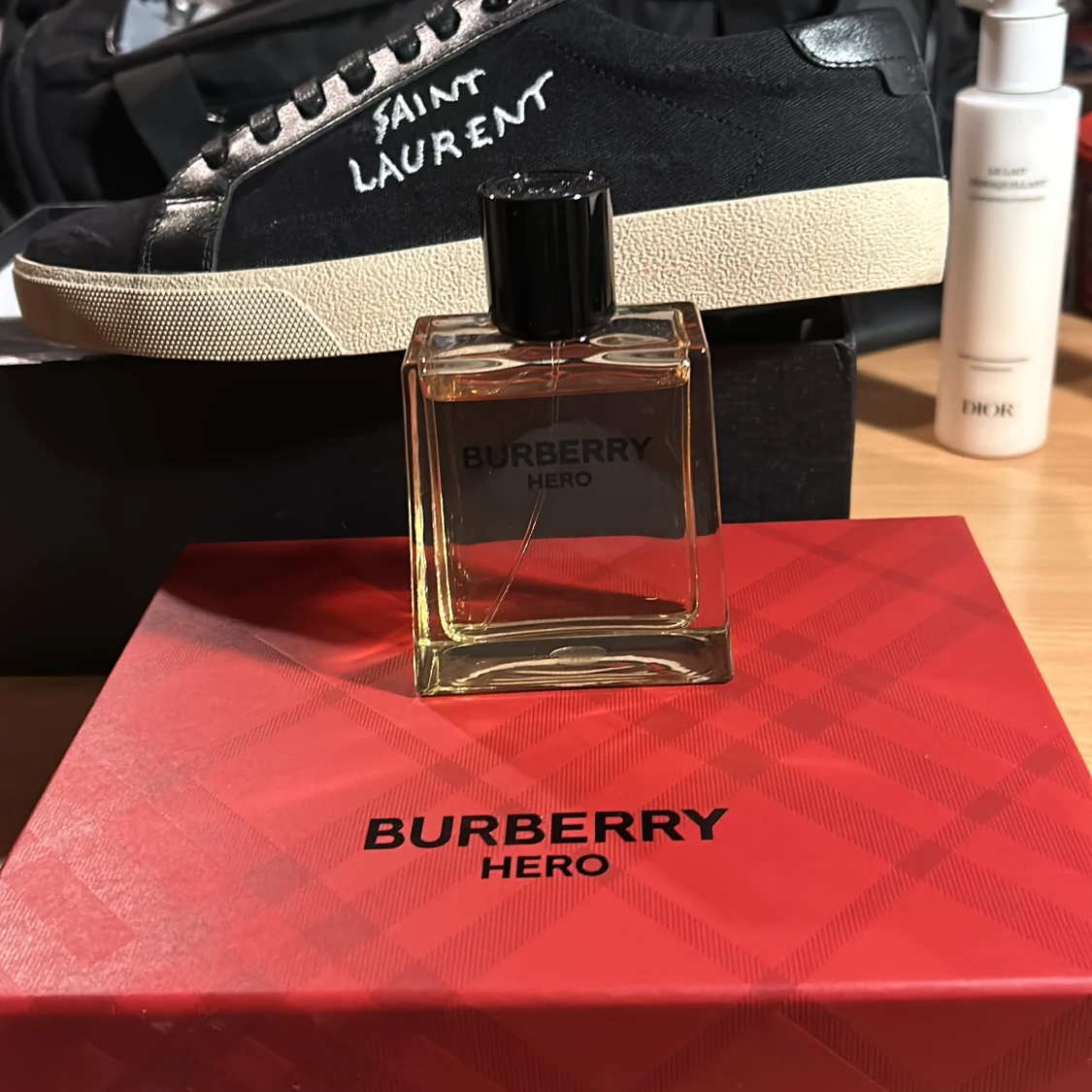 Säljer en elegant Burberry Hero parfym i en stilren, fyrkantig glasflaska med svart kork. Flaskan står på en röd kartong med Burberry-loggan. Perfekt för den som vill ha en sofistikerad doft med en touch av lyx. Passar både till vardags och speciella tillfällen.