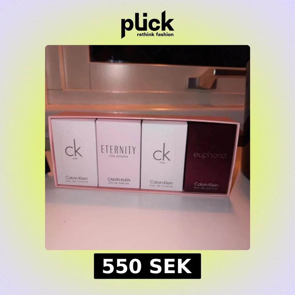 Upptäck fyra Calvin Klein-parfymer i smidiga miniflaskor: CK One, Eternity for Women och Euphoria. Perfekt för resan eller att testa nya favoriter. Innehåller totalt 2x10 ml CK One, 5 ml Eternity och 4 ml Euphoria. Pris gäller alla 4. Perfekt storlek på resande fot eller för att testa innan man köper stor flaska. Aldrig öppnat. Kontakta mig om du vill köpa styckvis, 150:-/st