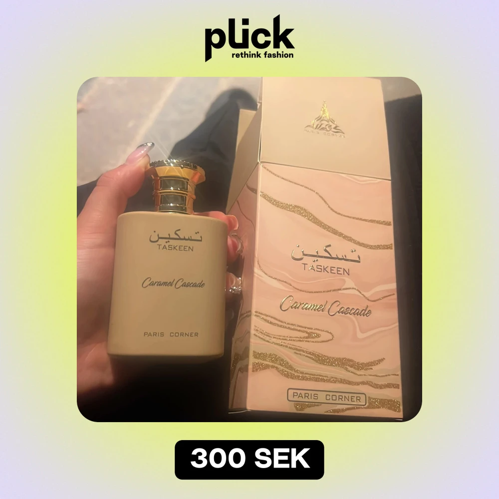 Elegant parfymflaska i beige med gyllene detaljer från Paris Corner. Doften heter Caramel Cascade och kommer i en stilren förpackning med marmorliknande mönster i rosa och guld. Perfekt för den som älskar söta och lyxiga dofter.
