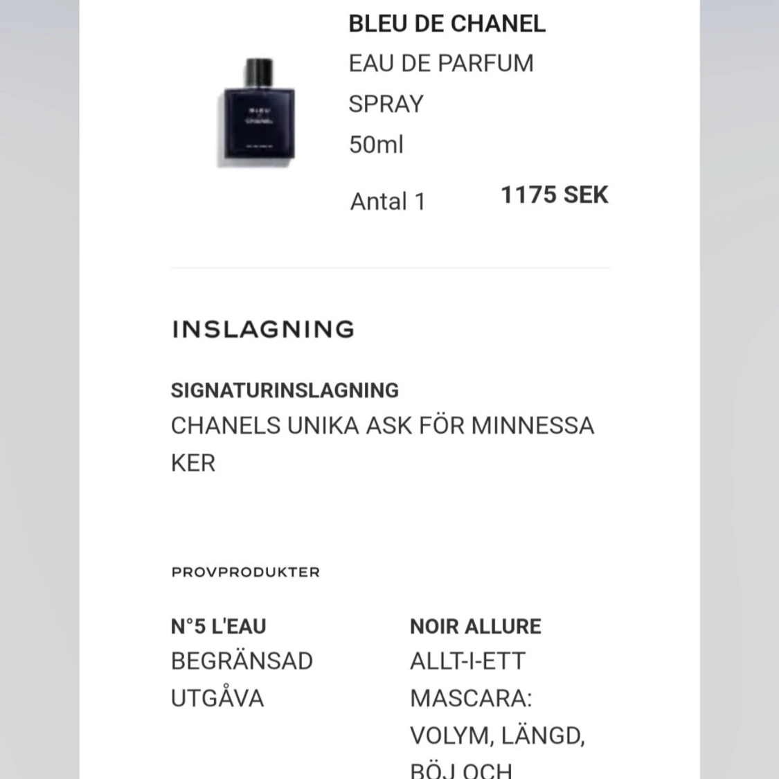 Säljer en elegant och tidlös Bleu de Chanel Eau de Parfum. Flaskan är mörkblå och stilren med en svart kork. Perfekt för den som vill ha en sofistikerad doft med inslag av citrus och tränoter. Kommer med originalförpackning och ett kort från Chanel. Är 50 ml och finns cirka kvar 45 ml i den mängd syns i bild 4. Kan ta vissa byten. Skriv vid funderingar. 😄