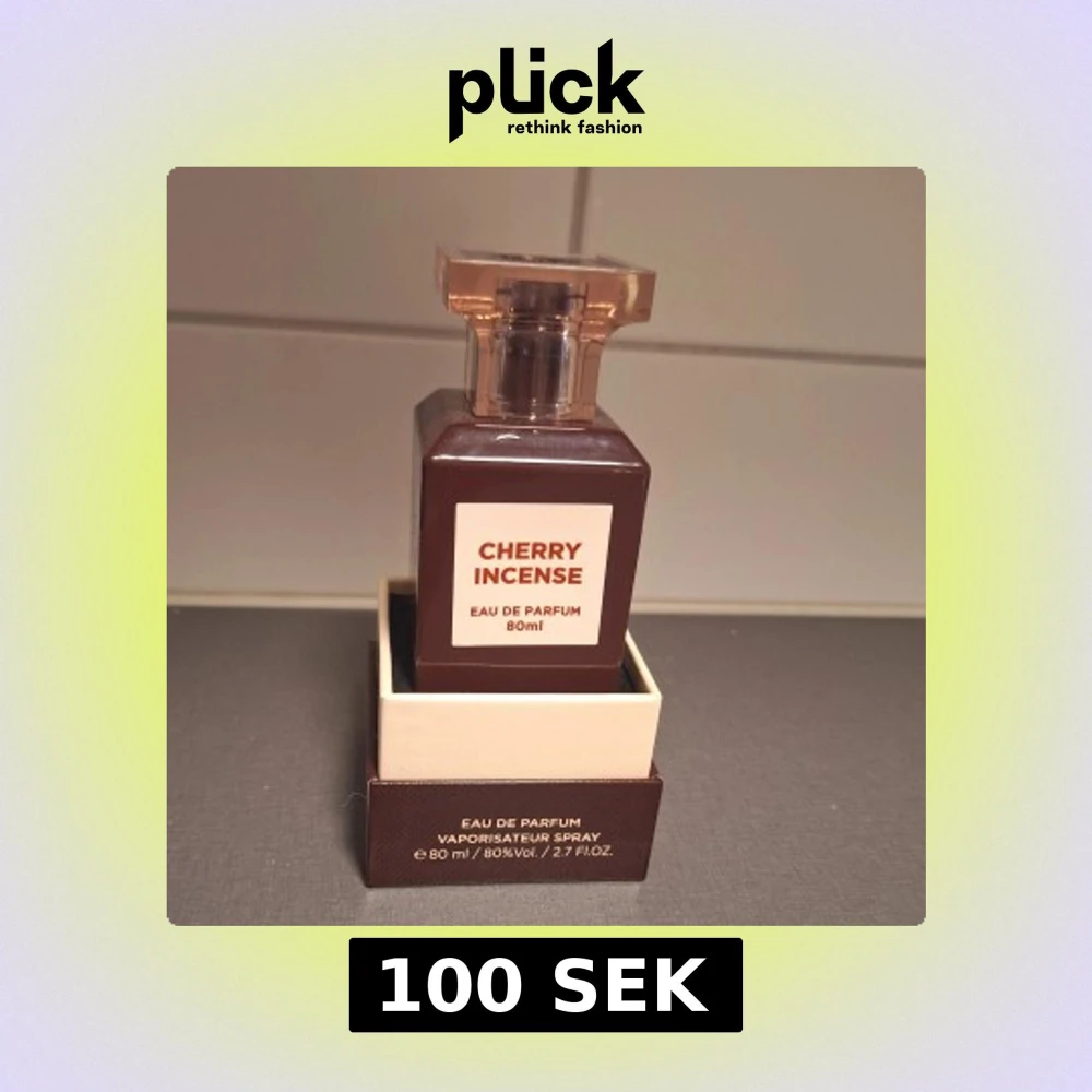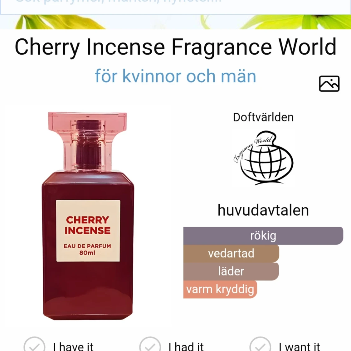 Cherry Incense från Fragrance World är en eau de parfum på 80 ml med en djup rödbrun glasflaska och transparent lock. Doften har rökiga, vedartade och läderaktiga toner med varm kryddighet. Passar både kvinnor och män som gillar unika och intensiva dofter.(Några ml taget)