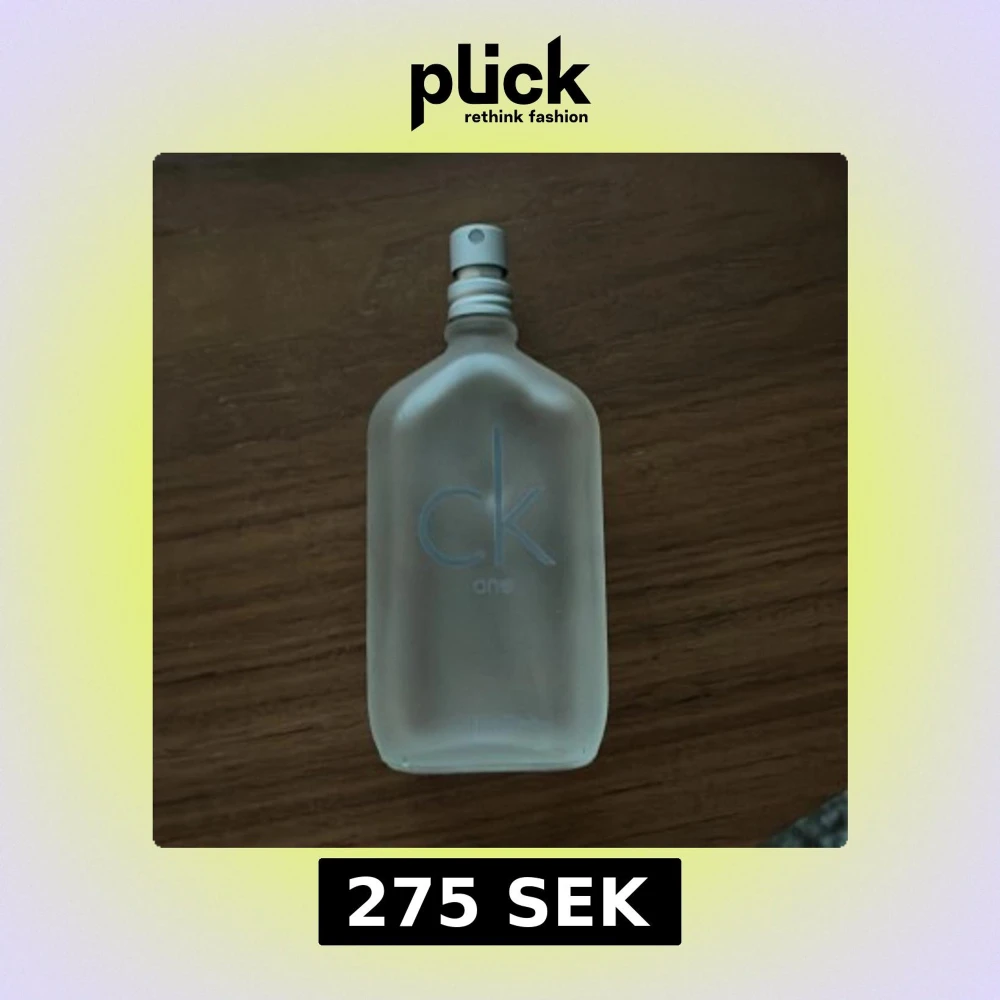 Minimalistisk parfymflaska från Calvin Klein, CK One. Flaskan är i frostat glas och har en stilren, rektangulär form. Diskret logga på framsidan. Perfekt för dig som gillar klassisk och fräsch doftdesign.
