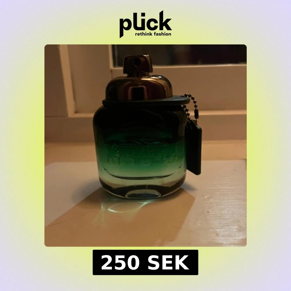 Säljer en elegant herrparfym från Coach i en stilren grön flaska med metallkork. Flaskan har en ingraverad logotyp och en svart lädertag. Perfekt för den som vill ha en sofistikerad doft. Ungefär 55 % kvar i flaskan