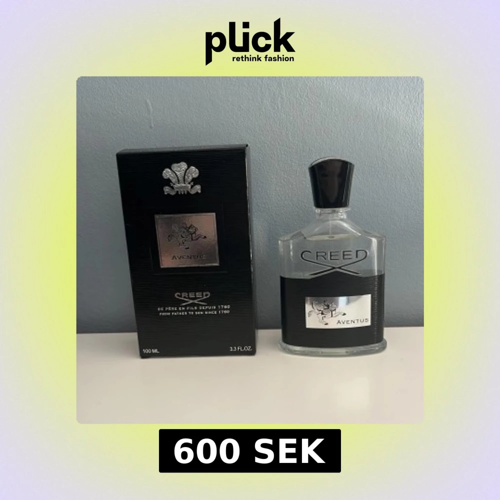 Exklusiv Creed Aventus parfym i en elegant glasflaska med svart kork och detaljer. Förpackningen är stilren med silverdetaljer och logotyp. Flaskan rymmer 100 ml av denna ikoniska doft.