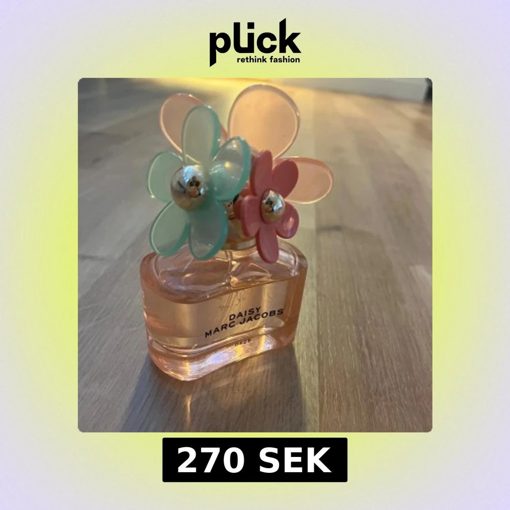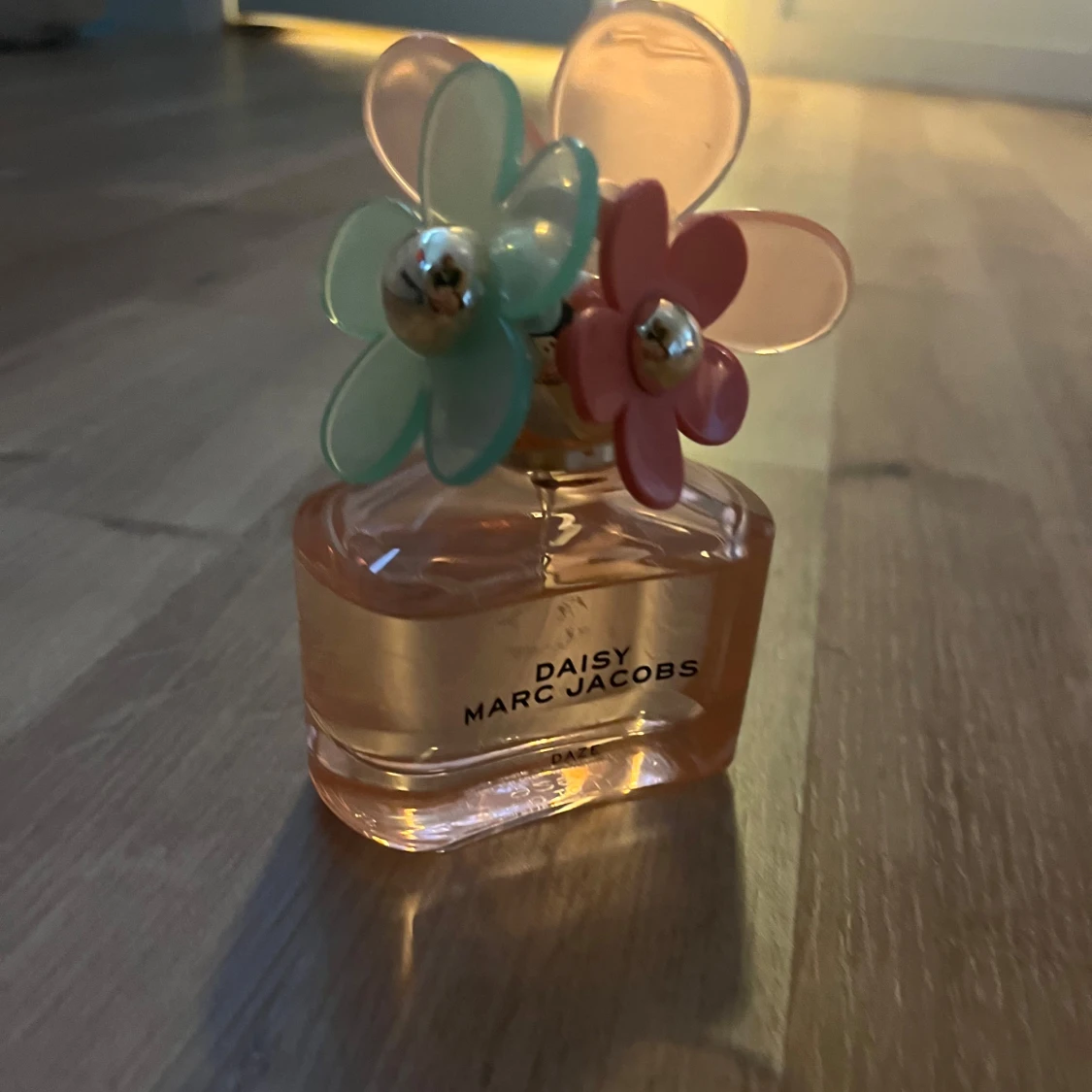 Säljer en Daisy Daze parfym från Marc Jacobs med en söt flaska i ljusrosa glas och dekorativt lock med stora plastblommor i mintgrönt och rosa. Flaskan har en modern, rundad form och blommorna har guldfärgade detaljer i mitten. Använd några gånger🩷