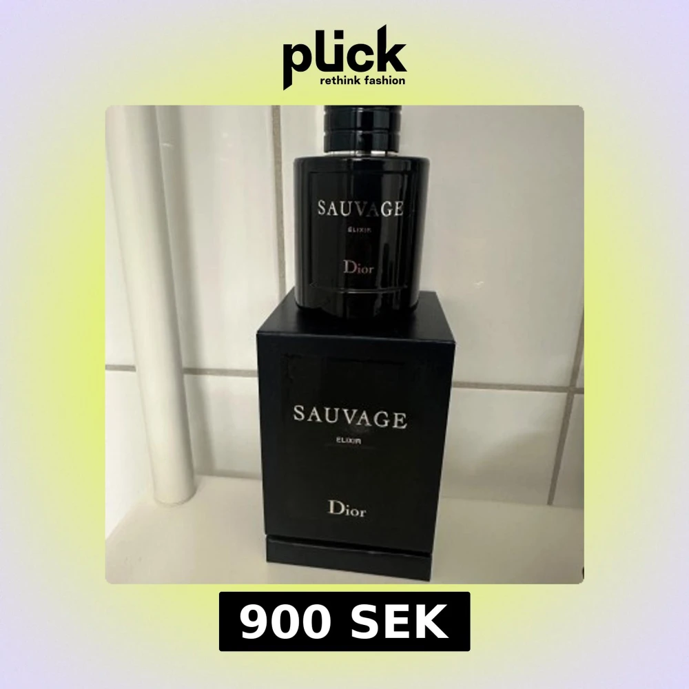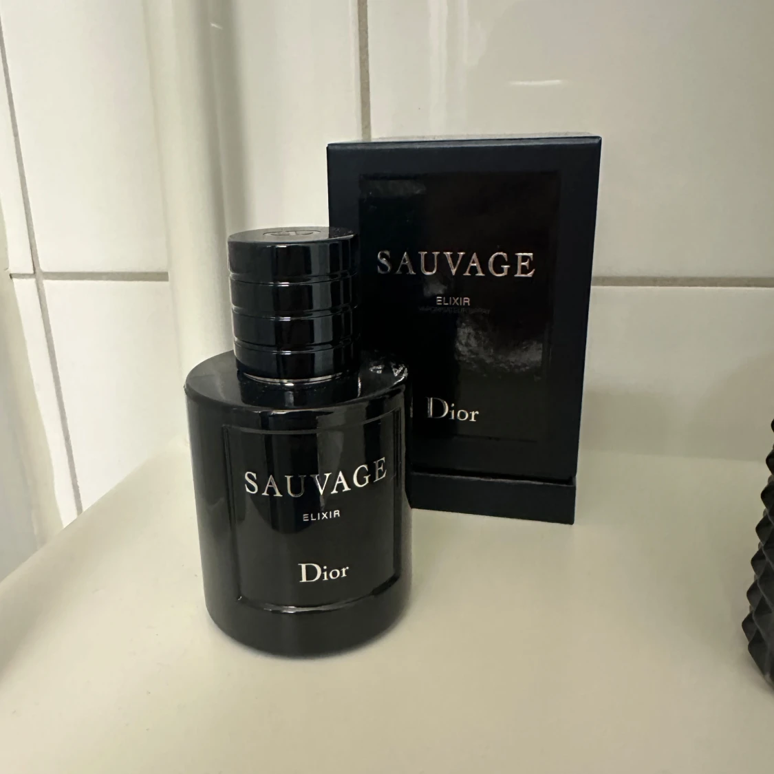 Säljer en elegant och intensiv parfym, Sauvage Elixir från Dior. Flaskan är mörk och stilren med en svart glansig yta och silverdetaljer. Perfekt för den som söker en kraftfull och sofistikerad doft.
