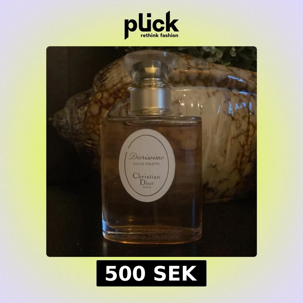 Diorissimo Eau de Toilette från Christian Dior i en elegant, genomskinlig glasflaska med rundade kanter och silverfärgad detalj på korken. Doften har en ljus, lätt rosa ton och flaskan har en klassisk oval etikett framtill.