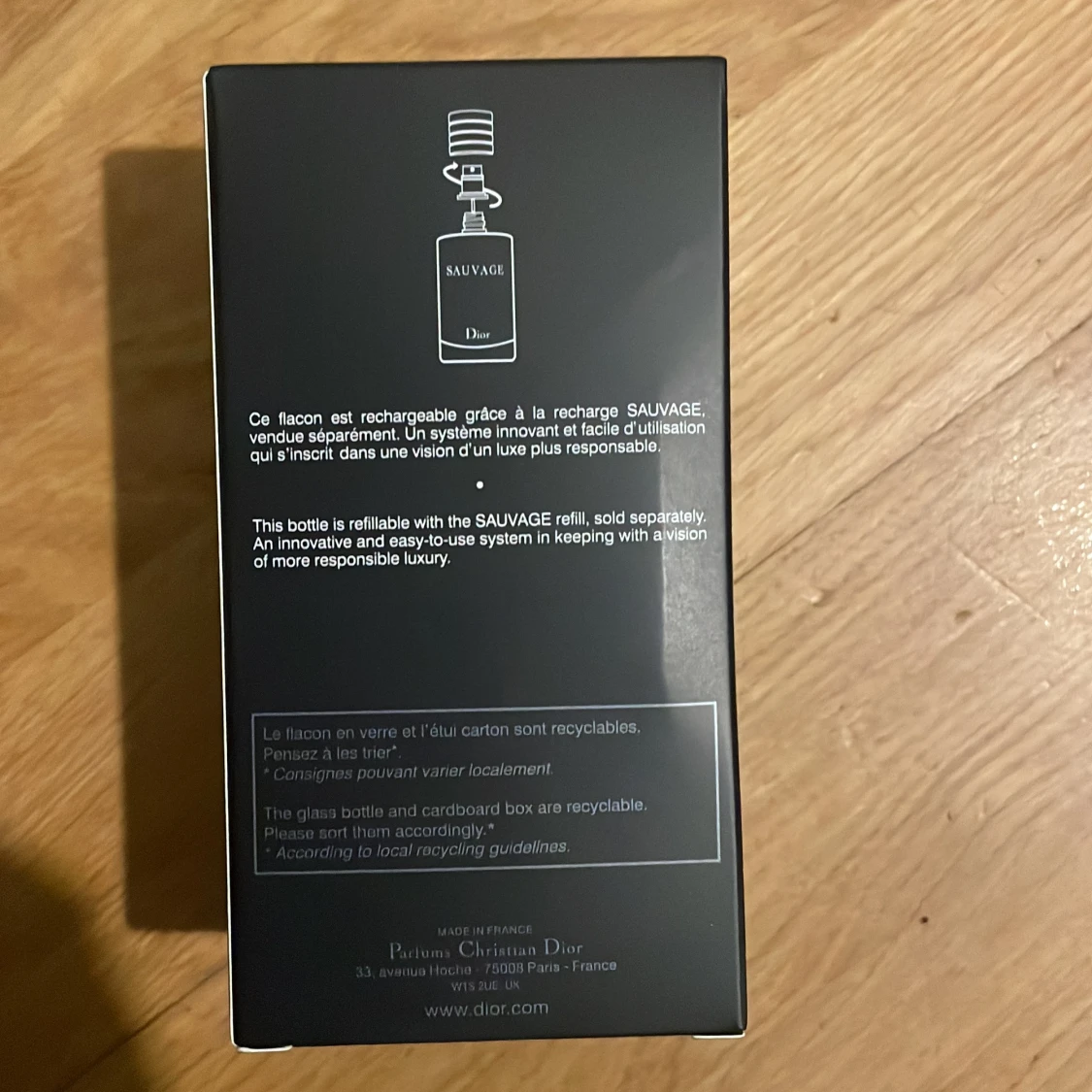 Sauvage Eau de Parfum från Dior, 100 ml. Flaskan är återfyllningsbar och tillverkad i Frankrike. Ingredienser: alkohol, parfym, vatten, limonene, linalool, coumarin, citronellol, geraniol m.fl. Perfekt för dig som vill ha en ikonisk doftupplevelse med stil.
