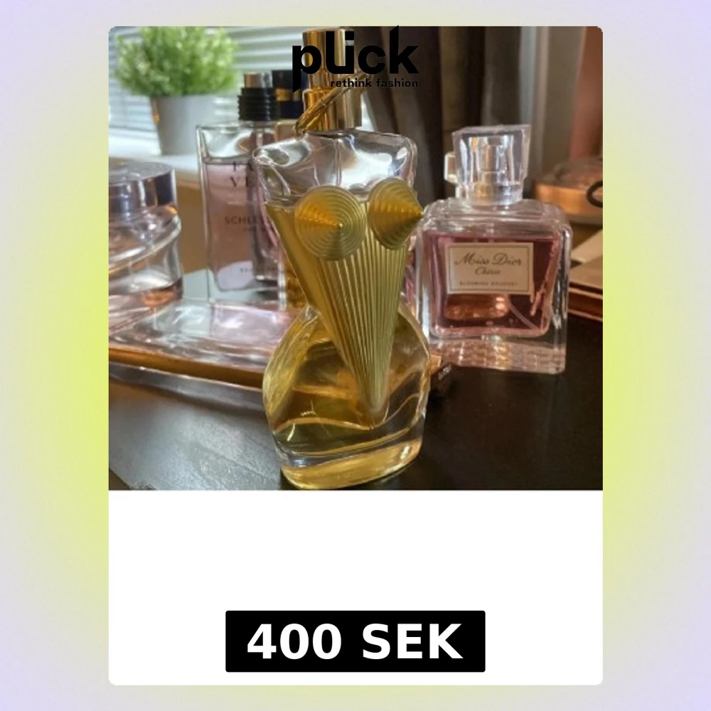 Unik parfymflaska från Jean Paul Gaultier, formad som en kvinnokropp med guldiga detaljer och skulpturala former. Flaskan är genomskinlig och innehåller en gyllene vätska. Perfekt för dig som gillar ikoniska och konstnärliga dofter.