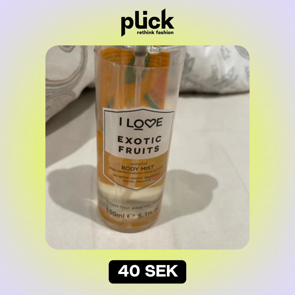 Säljer en fräsch och exotisk body mist från I Love med doft av mango, apelsin, melon och ananas. Flaskan är genomskinlig med en orange etikett och rymmer 150 ml. Perfekt för att känna sig uppfriskad och dofta gott hela dagen. Tillverkad i Storbritannien och fri från onödiga tillsatser. Perfekt för sommardagar eller när du vill känna dig extra fruktig! 🍍🍊. mer än halva flaskan finns kvar