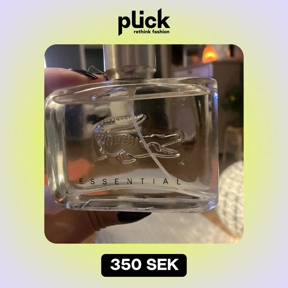 Säljer en stilren och fräsch parfym från Lacoste, modellen Essential. Flaskan är genomskinlig med en silverfärgad kork och har den ikoniska krokodilen ingraverad. Perfekt för vardagsbruk eller speciella tillfällen. Doften är lätt och uppfriskande, perfekt för dig som gillar en sportig och elegant stil. 75 ml