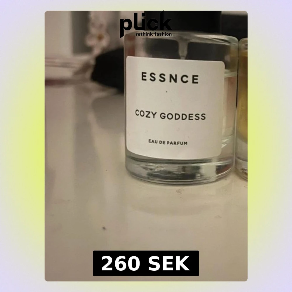 En stilren parfym från Essnce med namnet Cozy Goddess. Flaskan är rund och genomskinlig med en vit etikett och svart text. Parfymen har en modern och minimalistisk design, perfekt att ha framme på sminkbordet.