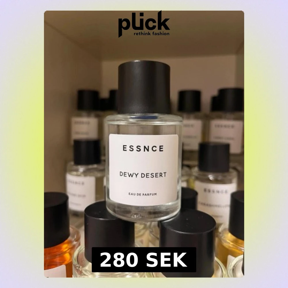 Minimalistisk parfymflaska från Essnce med doften Dewy Desert. Flaskan är cylindrisk i genomskinligt glas med svart plastlock och vit etikett med svart text. Perfekt för dig som gillar stilrena och moderna doftflaskor.