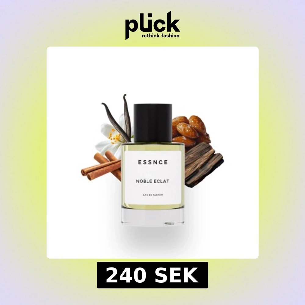 Parfymflaska i glas med svart lock och stilren vit etikett. Doften Noble Eclat har inslag av vanilj, kanel, dadlar och träiga noter. Flaskan är genomskinlig och vätskan är ljusgul. Perfekt för dig som gillar varma, kryddiga och söta dofter.