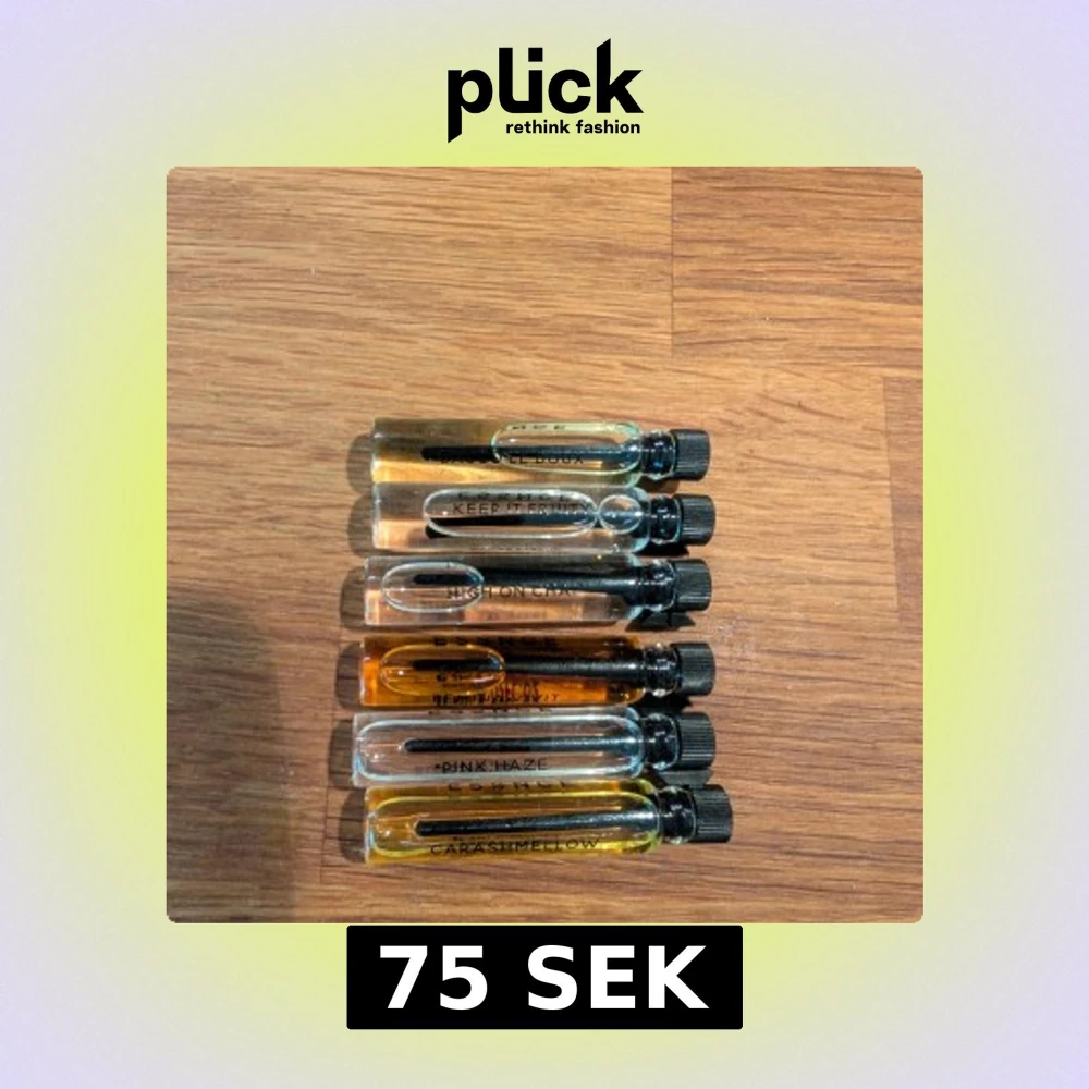 Sex små parfymprover från Essence a 2 ml: Bacco le doux, Keep it fruity, High on chai, Femina blivit, Pink Haze och Carashmellow. Alla är fulla utom Pink Haze och Carashmellow som har ca 75 % kvar. 75 kr för alla.