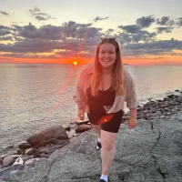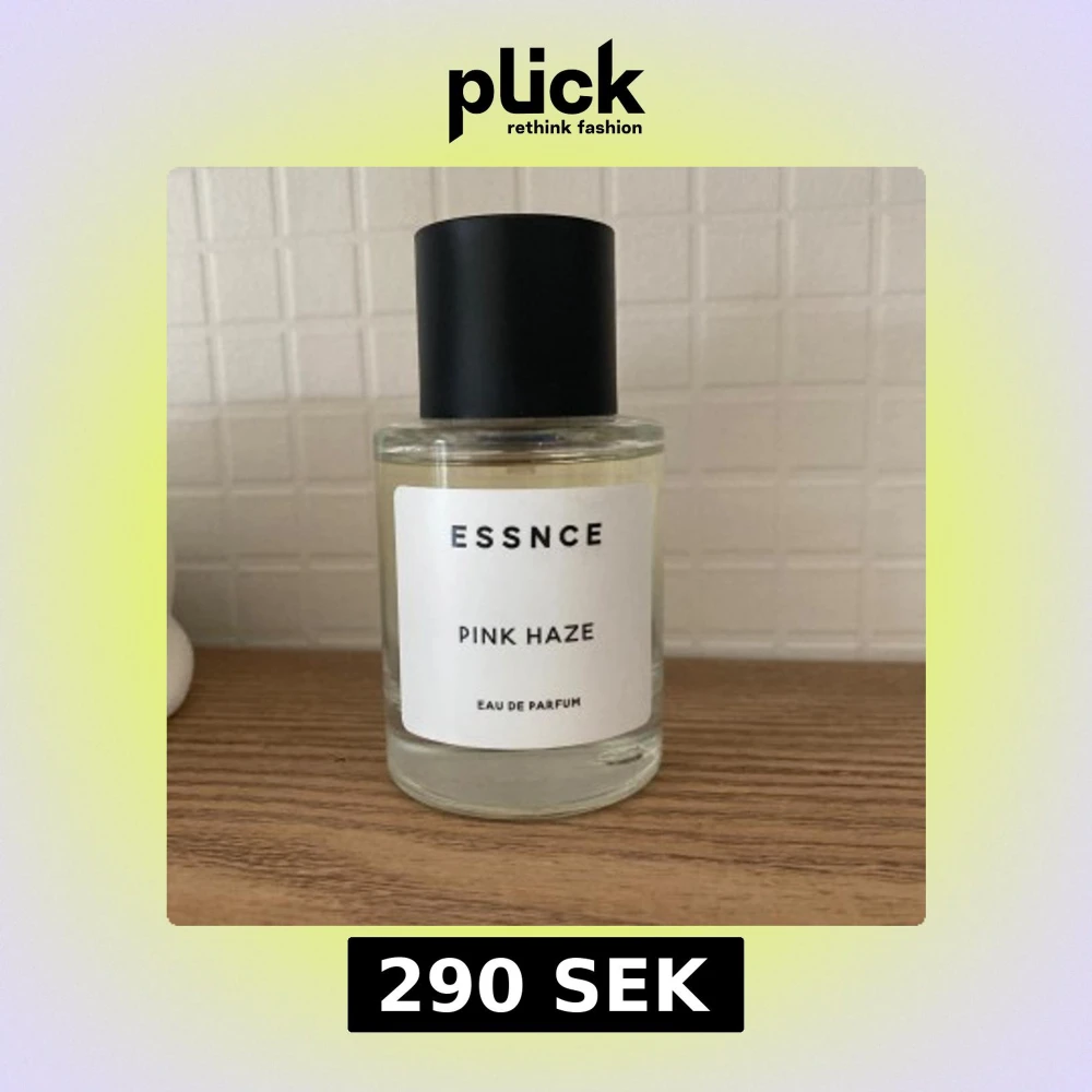 Säljer en flaska Essnce Pink Haze Eau de Parfum. Flaskan är genomskinlig med en enkel vit etikett och har en stilren svart kork. Perfekt för den som gillar en subtil och elegant doft.