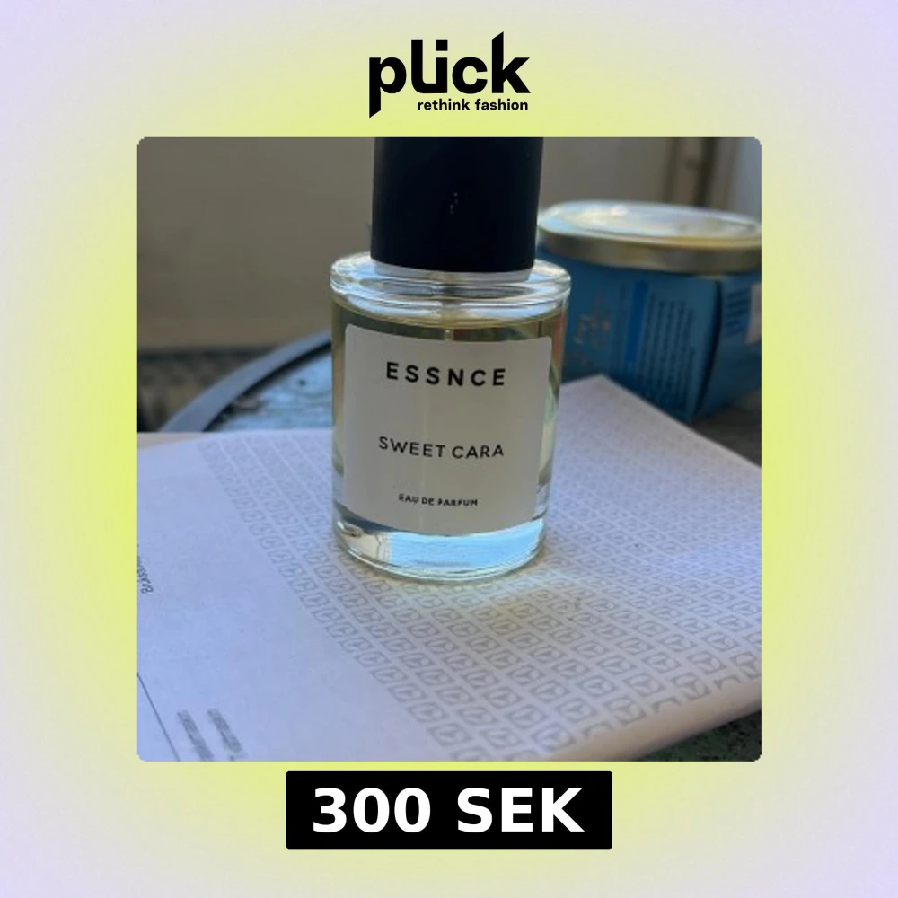 Fräsch parfym från ESSNCE med namnet Sweet Cara. Flaskan är genomskinlig med en enkel vit etikett och svart lock. Parfymen är en Eau de Parfum och har en stilren, modern design som passar perfekt på sminkbordet.