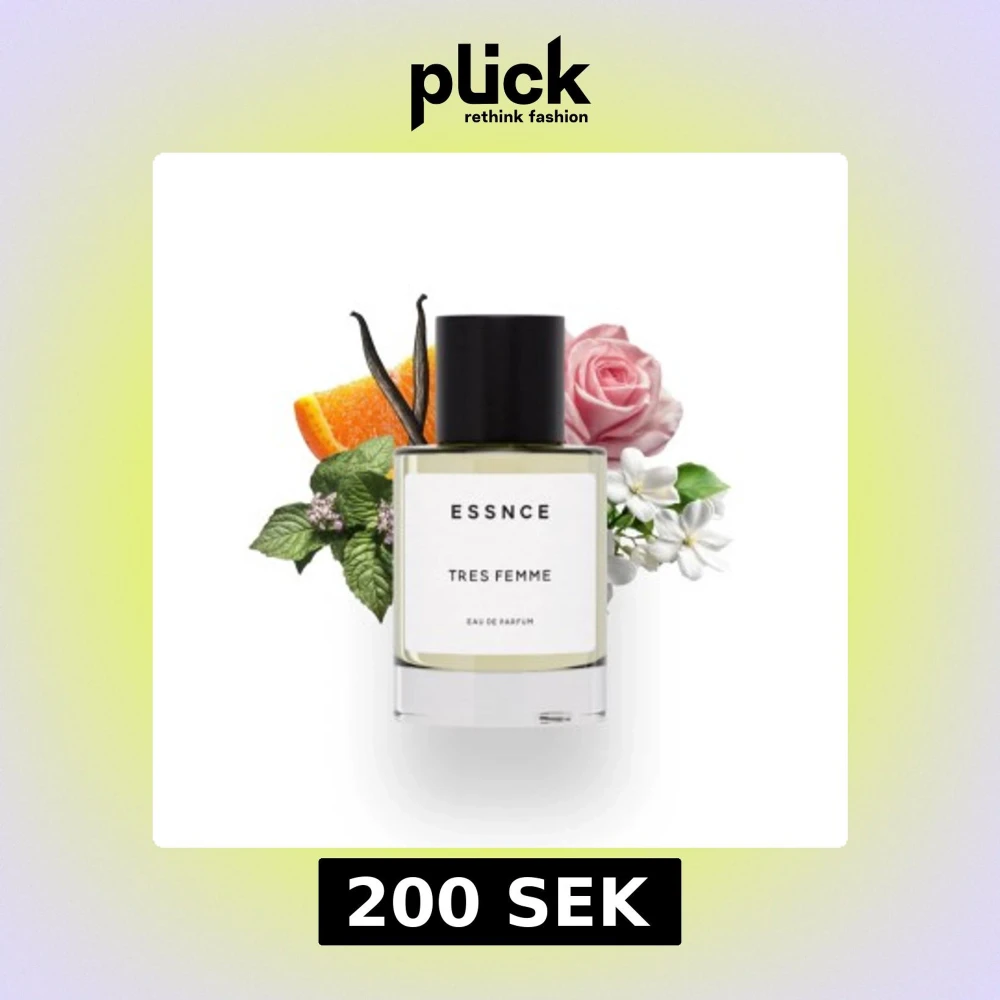 Upptäck Essnce Tres Femme, en elegant Eau de Parfum med en fräsch och blommig doft. Flaskan är stilren med en svart kork och etikett. Doften kombinerar noter av apelsin, ros, vanilj och jasmin för en sofistikerad upplevelse. HELT NY
