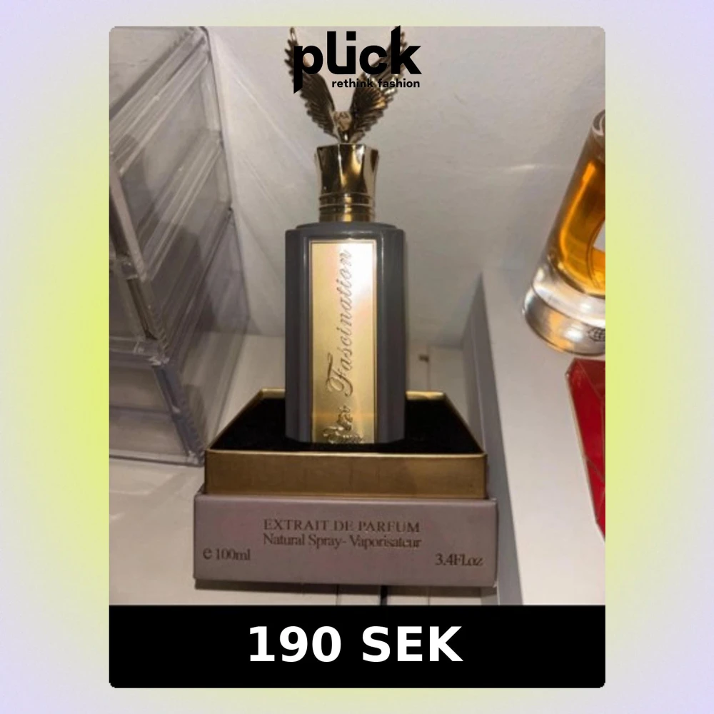 Lyxig parfymflaska i svart och guld med elegant rektangulär form och en unik kork med guldfärgade vingar. Flaskan rymmer 100 ml och har en exklusiv design som verkligen sticker ut på parfymhyllan. Perfekt för dig som gillar statement-detaljer.