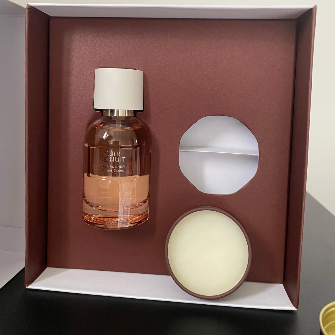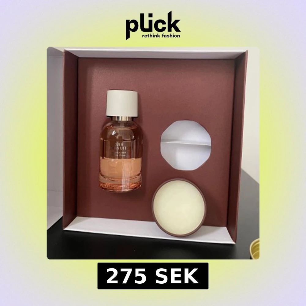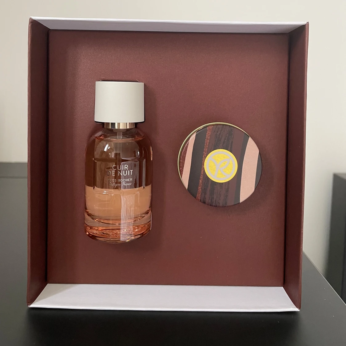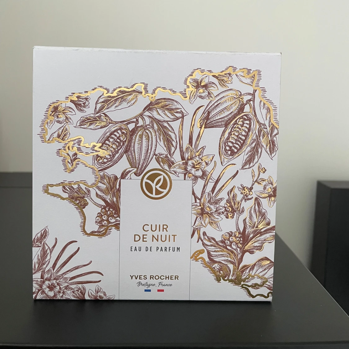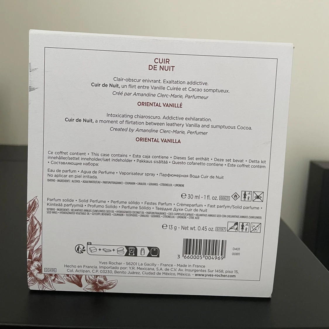 Lyxigt parfymset med Cuir de Nuit från Yves Rocher. Innehåller en 30 ml eau de parfum och en 13g krämparfym. Sprayparfymen användes en gång för att testa doften. Krämparfymen har inte använts. Setets ursprungliga pris var 360 sek. Doften är orientalisk vanilj med inslag av läder och kakao. Perfekt presentförpackning med botaniskt mönster.