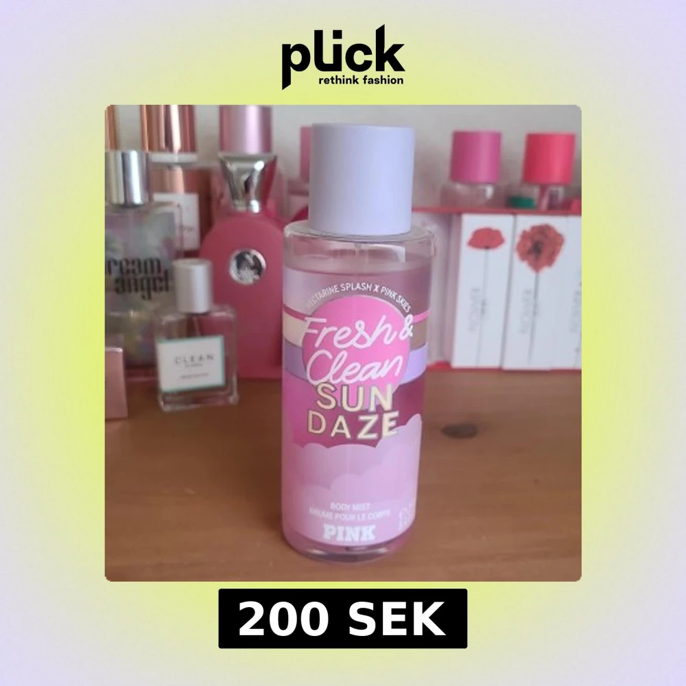 En fräsch och ren body mist med namnet Sun Daze från PINK. Flaskan är dekorerad i lila och rosa toner med text i guld och vitt. Perfekt för en uppfriskande känsla under soliga dagar. Säljs inte längre. Ordinarie pris 260kr.