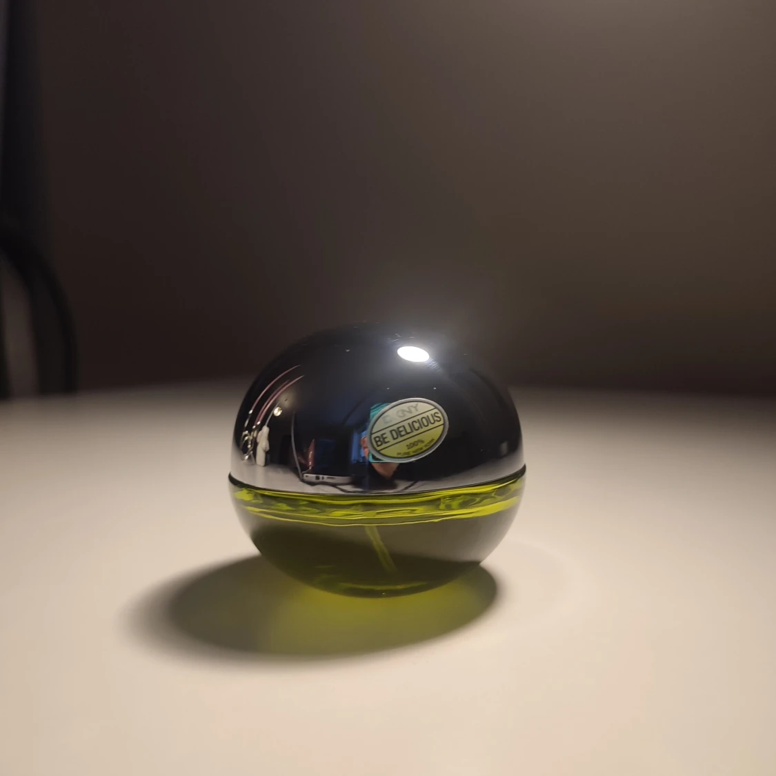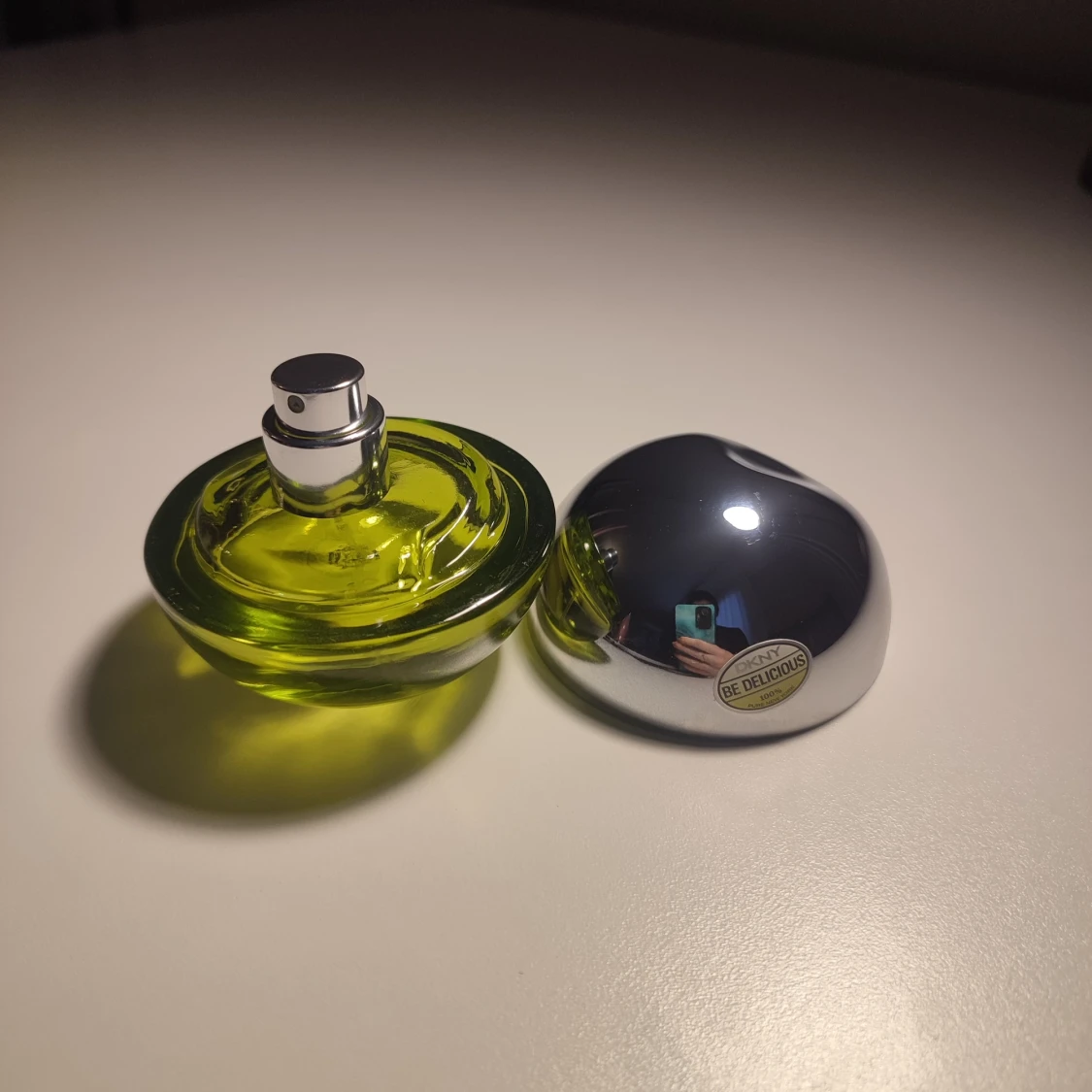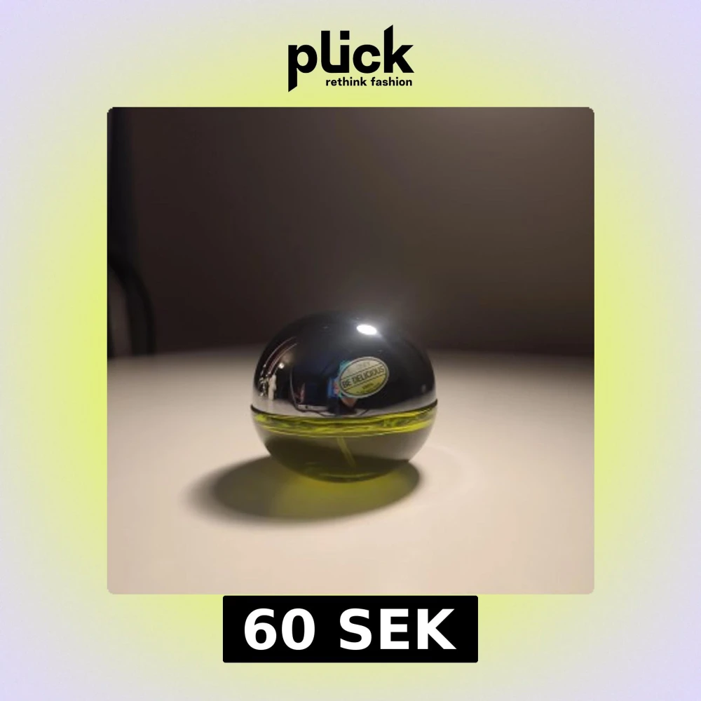 Säljer en fräsch parfym från DKNY, Be Delicious, med en unik äppelformad flaska. Flaskan är i en kombination av silver och genomskinligt grönt glas, vilket ger en modern och stilren look. 30 ml. Perfekt för den som älskar fruktiga och fräscha dofter. Parfymen är knappt använd, endast testas.