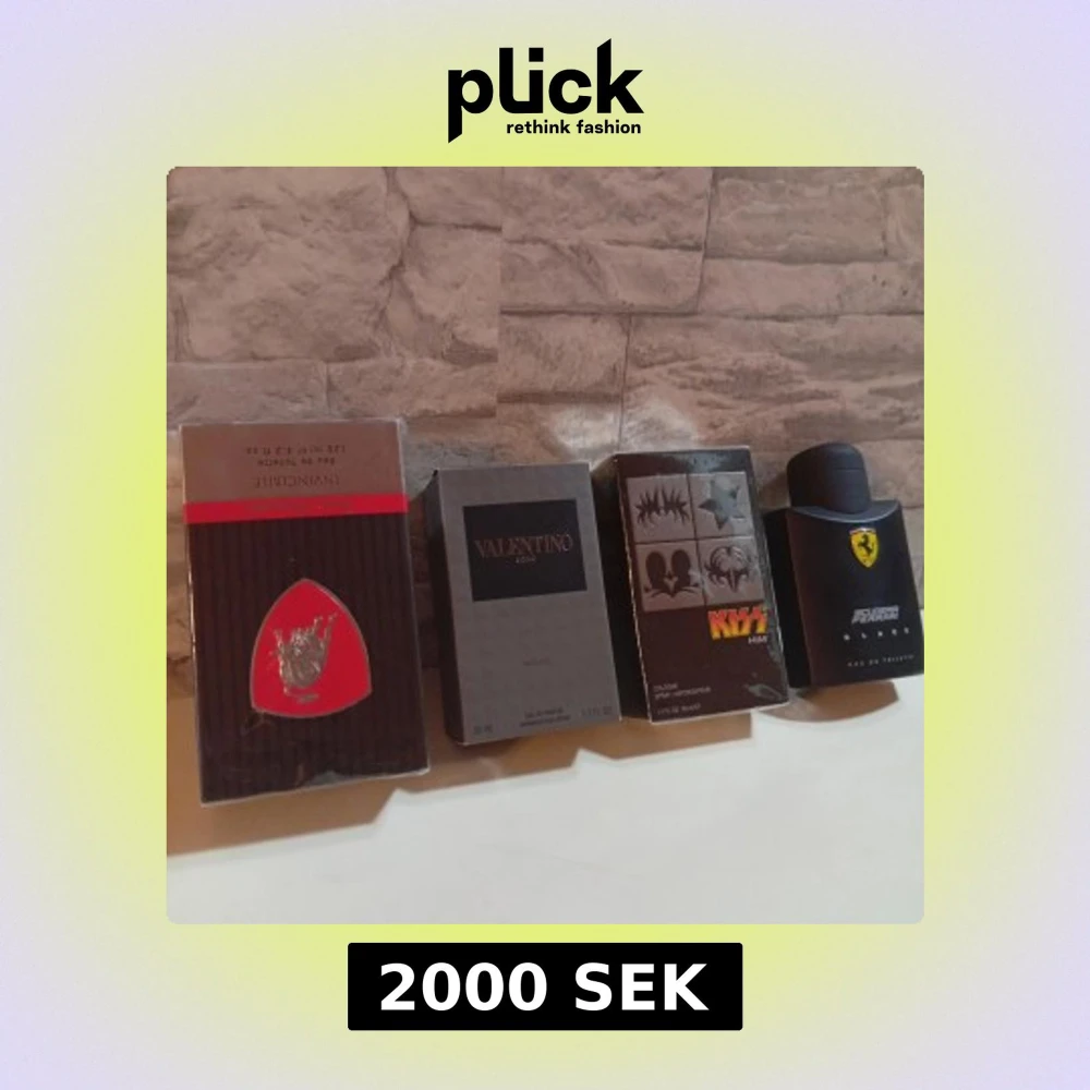 Säljer fyra olika herrparfymer: Invincible i svart och röd kartong med silverdetalj, Valentino Uomo Intense i stilren grå ask, Kiss Him i svart kartong med rockiga motiv och Scuderia Ferrari Black i svart flaska med gul Ferrari-logga. Perfekt för dig som gillar att variera doft. Alla Helt nya . 2000 kr alla 4