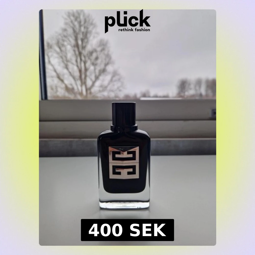 Snygg parfymflaska från Givenchy i svart glas med silverfärgad logga på framsidan. Flaskan har en stilren, fyrkantig form och svart lock. Perfekt för dig som gillar exklusiva och moderna dofter.