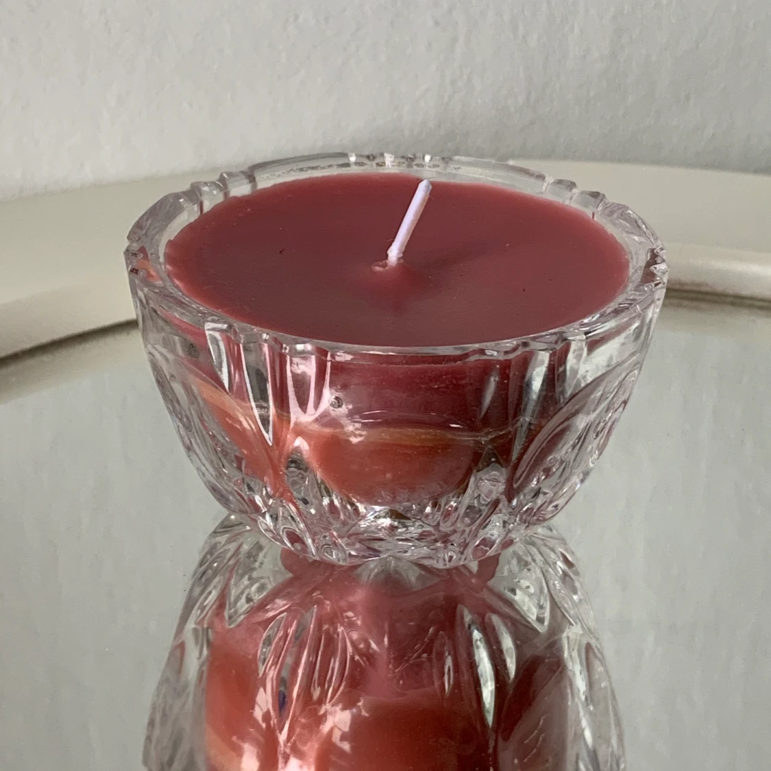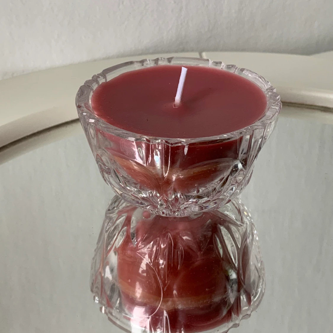 Jag gör ljus av gamla ljusstumpar som skulle ha slängts och av secondhand köpta behållare. Detta ljus är 4,5cm högt och 8cmd. Det har en svag doft och flera färglager☺️
