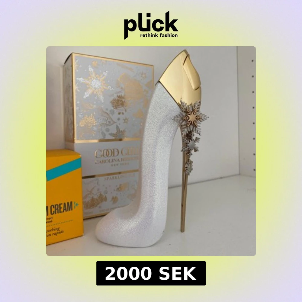 Limited edition från Carolina Herrera En lyxig parfym i en unik flaska formad som en högklackad sko. Flaskan är vit med glittrande detaljer och en elegant guldklack. Förpackningen har ett vackert vintertema med snöflingor och gyllene detaljer. Perfekt för den som vill ha en doft med stil och elegans.