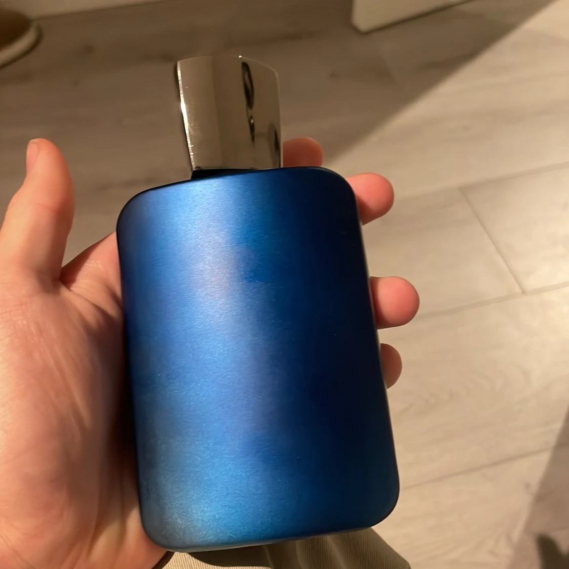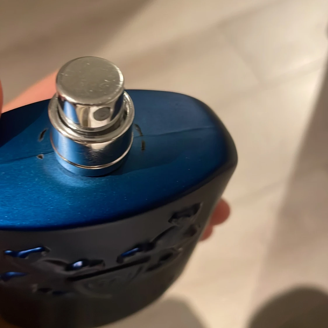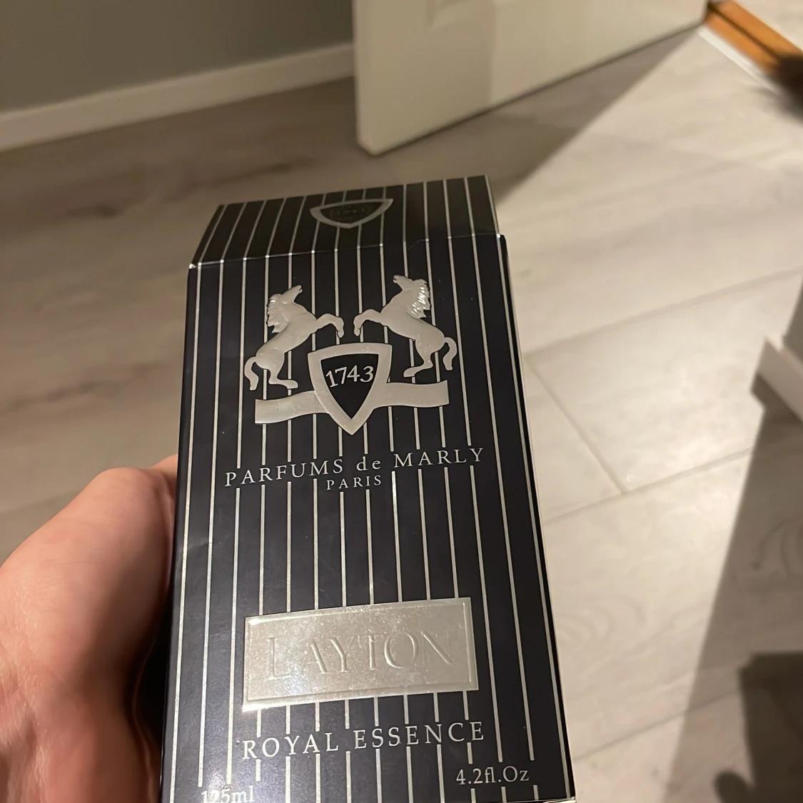 Säljer en flaska Parfums de Marly Layton, en lyxig herrparfym i en elegant blå flaska med silverdetaljer. Flaskan har en stilren design med två upphöjda hästar och texten '1743'. Kommer i en snygg förpackning med svart och silverrandigt mönster. Korken sitter inte bra, den sitter inte fast, skicka innan köp