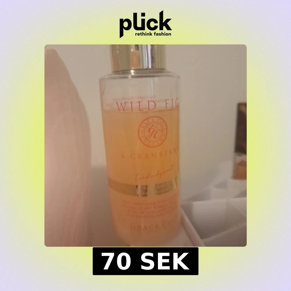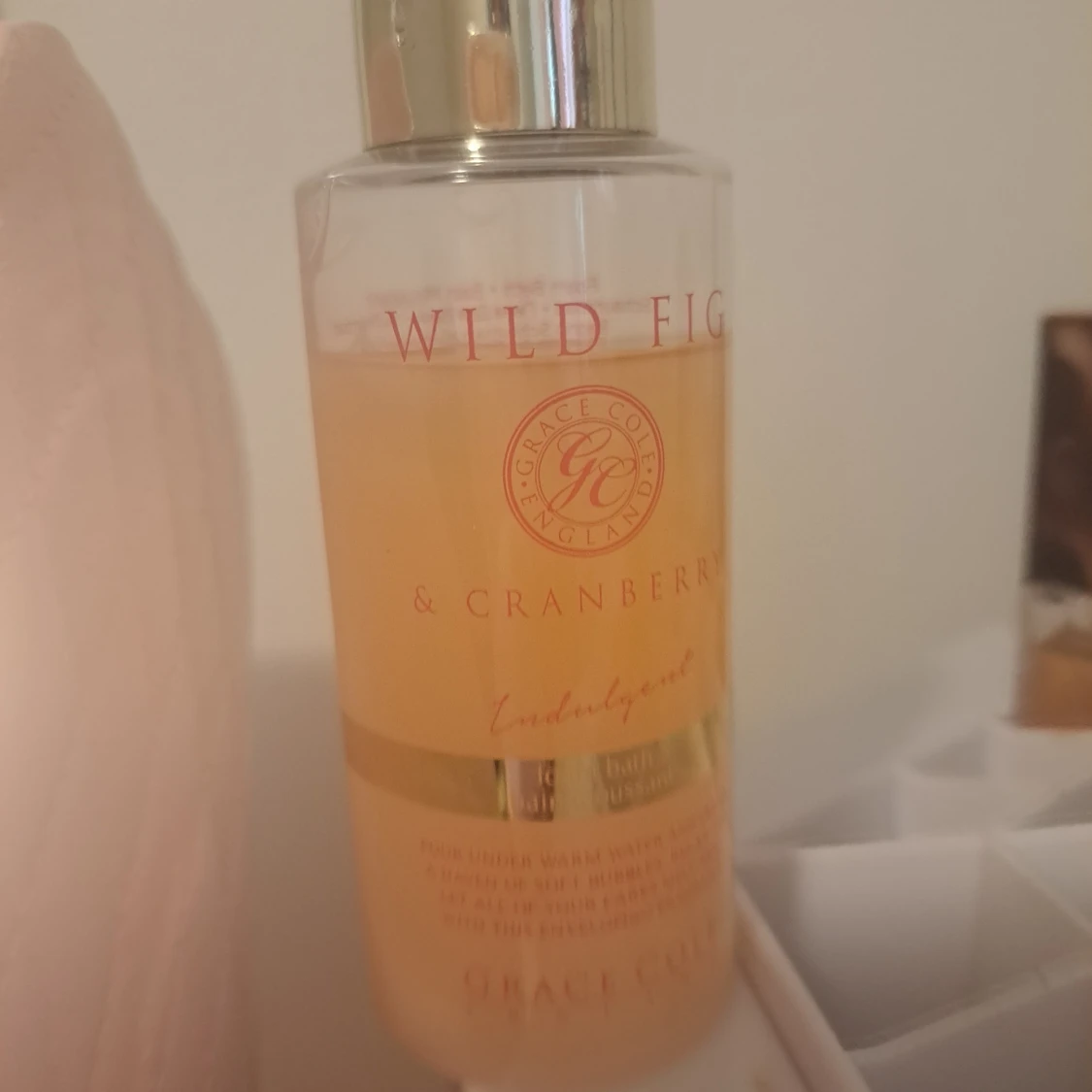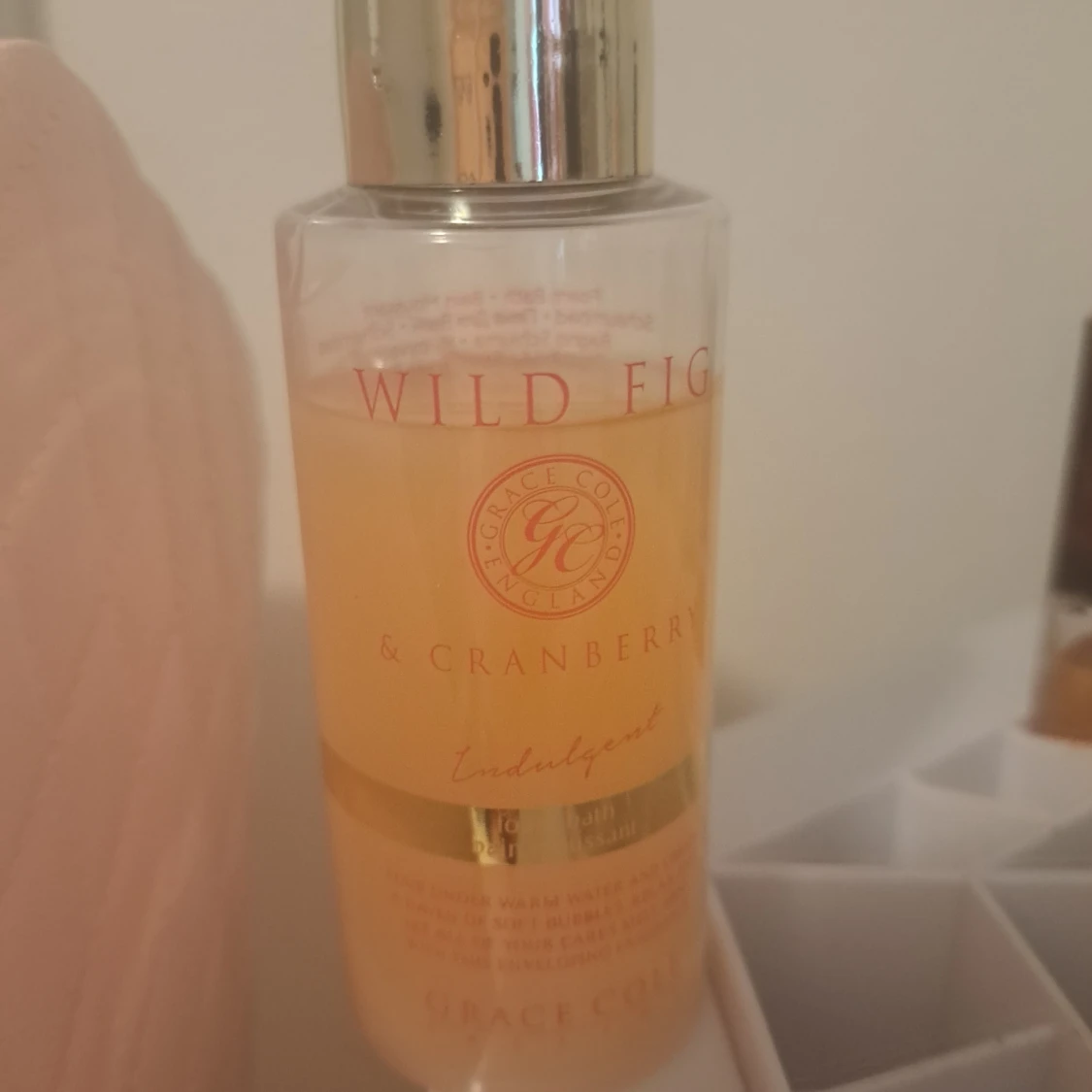 Fräsch bath bubbles från Grace Cole med doft av vild fikon och tranbär. Flaskan är genomskinlig med guldigt lock och detaljer, och innehållet har en ljus orange ton. Perfekt för dig som gillar fruktiga och söta dofter.