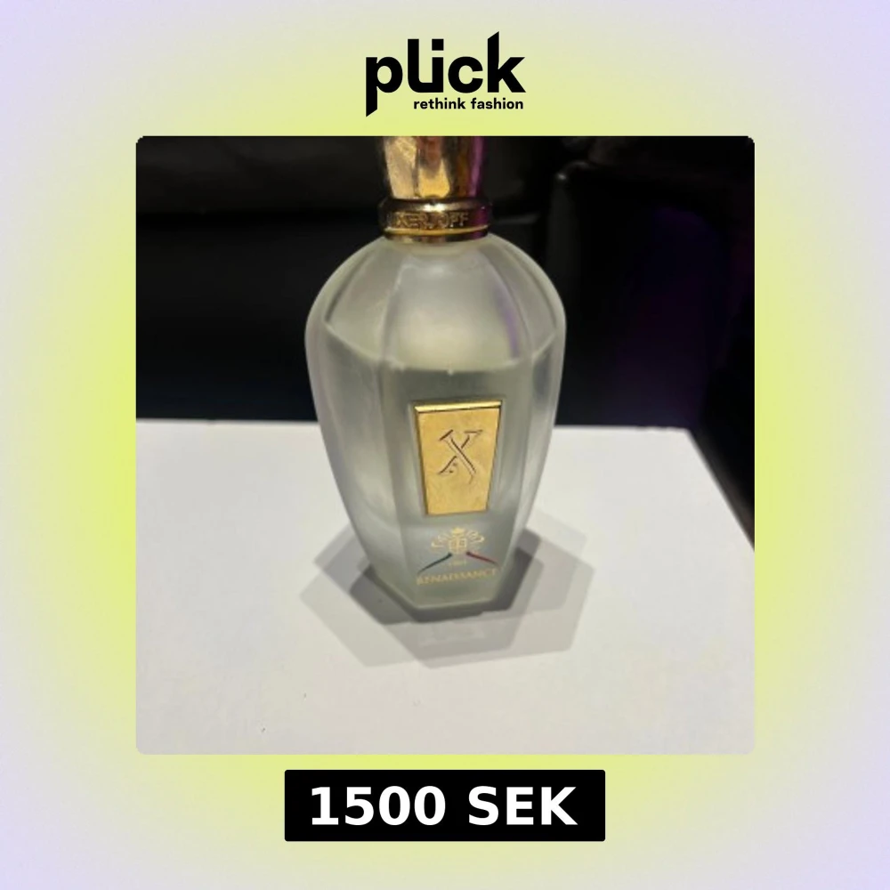 Xerjoff parfym med en frostad glasdesign och gyllene detaljer. Flaskan har en distinkt form och kommer i en lyxig presentförpackning. Har en lyxig doft med toner av till exempel citrus. Måttligt använd, Nypris 2800 kr.