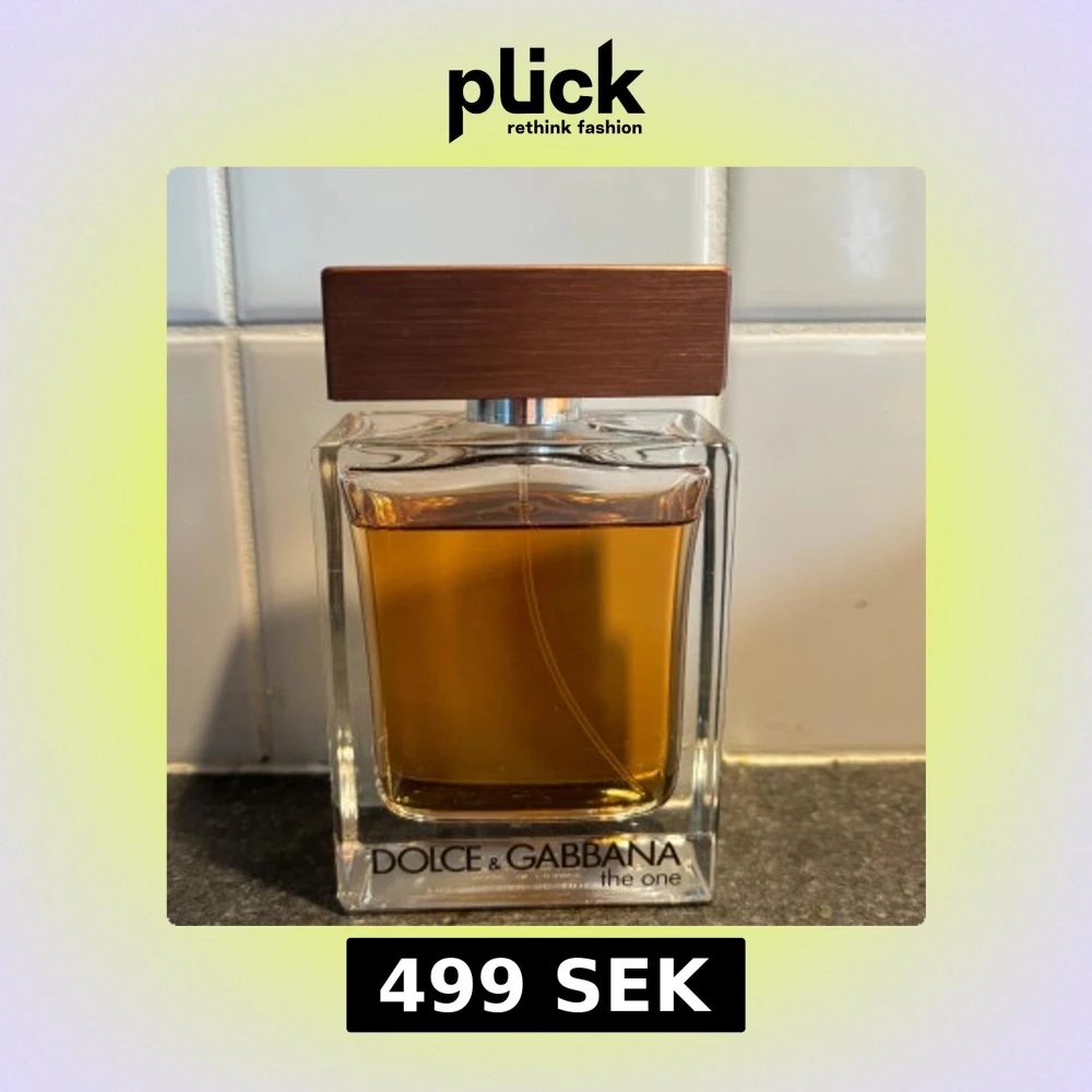 Säljer en elegant herrparfym från Dolce & Gabbana, The One. Flaskan har en stilren design med en fyrkantig form och en brun kork. Doften är varm och kryddig, perfekt för den som vill ha en sofistikerad och tidlös parfym.
