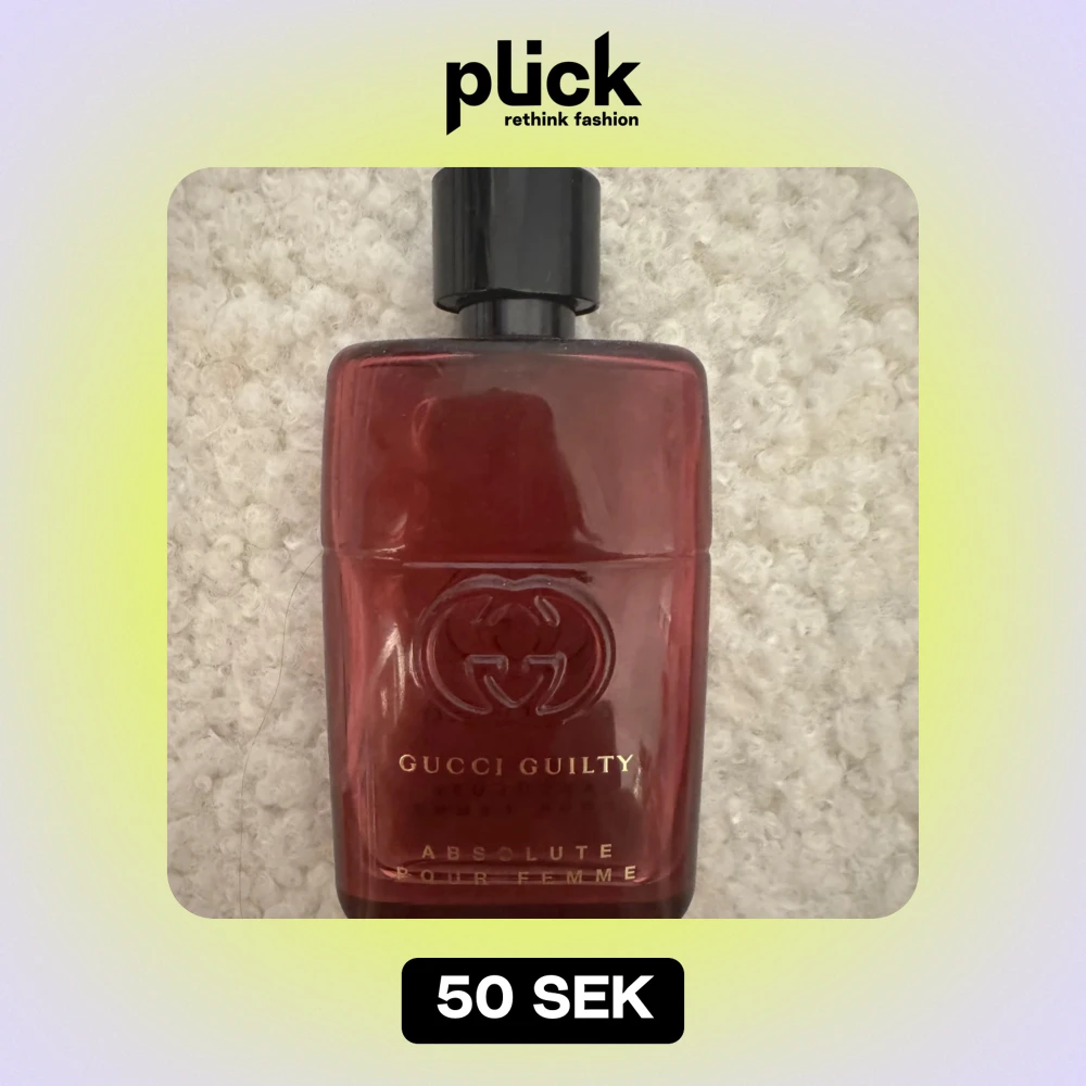 Elegant parfymflaska i djupröd nyans från Gucci. Flaskan är halvfull. Flaskan har en stilren design med svart kork och det ikoniska Gucci-emblemet ingraverat. Doften är en del av Guilty-serien och passar den som söker en sofistikerad och djärv doftupplevelse.