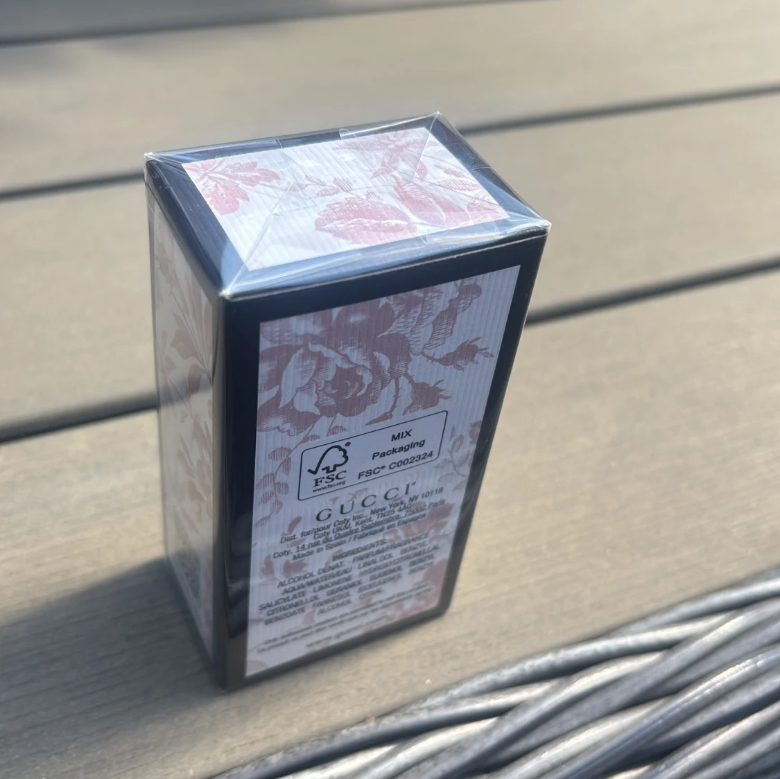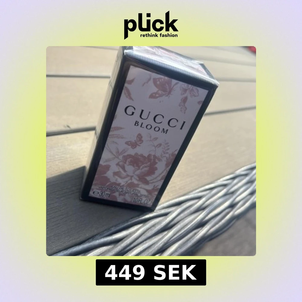 Gucci Bloom Eau de Toilette i 30ml flaska. Förpackningen är dekorerad med blommor och fjärilar i dova rosa toner mot vit bakgrund, med svarta kanter. Lyxig och feminin doft från ett ikoniskt modehus. Perfekt storlek för att ta med i väskan.
